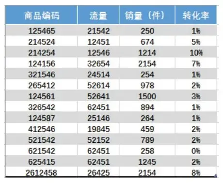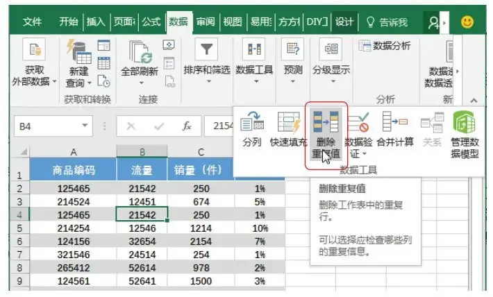 步骤 04 查看删除效果。如下图所示, 执行【删除重复值】 命令后, 表格中编码重复商品(包括编码号、 流量、 销量、 转化率) 的所有数据均被删除, 十分方便。