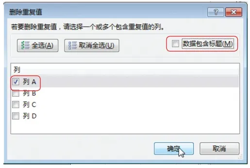 步骤 02 设置删除条件。此时会弹出【删除重复值】 对话框。在该对话框中, 应该选择有重复数据出现的列, 且这样的重复没有意义。例如,“流量”“销量” 列不应该选择, 因为流量和销量数据相同是正常的, 这样的重复是有意义的。而“商品编码”列数据重复, 就表示重复统计了商品数据。因此选中【列 A】 复选框, 取消选中【数据包含标题】复选框, 最后单击【确定】 按钮, 如下图所示。