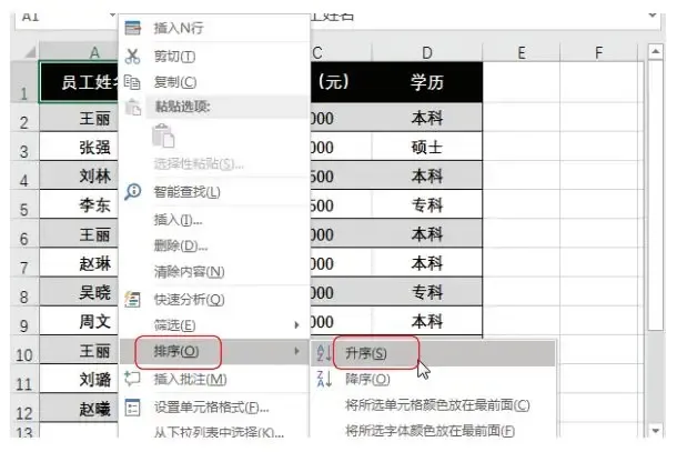 步骤 01 排序。在进行表格数据去重时, 对有重复数据的列进行排序, 且数据重复无意义。如下图所示的表格中, 对“员工姓名”列进行排序, 而不是“学历” 列, 因为学历重复很正常, 不能作为数据是否重复的判断标准。右击【A1】(“员工姓名”) 单元格, 在弹出的快捷菜单中选择【排序】→【升序】 选项。