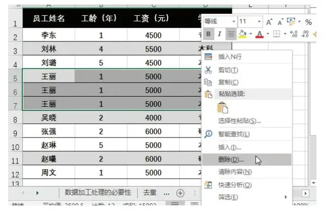 步骤 02 删除重复数据。员工姓名经过排序后, 姓名相同的会排列在一起, 此时可以快速找到重复数据, 判断是否需要删除。如果需要删除, 则选中这些数据并右击, 在弹出的快捷菜单中选择【删除】 选项,如下图所示。