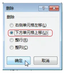 步骤 03 设置删除方式。Excel 删除单元格的方式有多种, 这里选中【下方单元格上移】单选按钮, 让下方有数据的单元格上移, 弥补被删除的单元格。