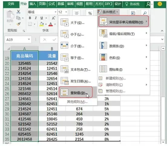 步骤 01 执行条件格式命令。选中需要删除重复值的数据列, 如下图所示, 这里选中 A 列数据, 选择【开始】选项卡下【条件格式】 下拉菜单中的【突出显示单元格规则】 选项, 再选择级联菜单中的【重复值】选项。