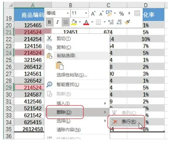 步骤 02 删除重复值。此时 A 列数据中, 重复的商品编码被填充上红色底色, 按住【Ctrl】 键, 依次选中这 3个单元格并右击, 在弹出的快捷菜单中选择【删除】→【表行】 选项, 即可删除这 3 行重复数据。