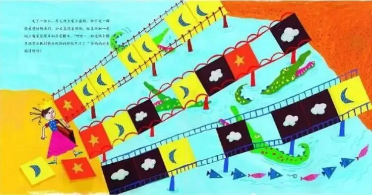 走了一会儿,看见河上有三座桥。桥下是一群张着嘴的鳄鱼们。公主急得直跺脚,但是仔细一看,地上有星星图片和月亮图片。