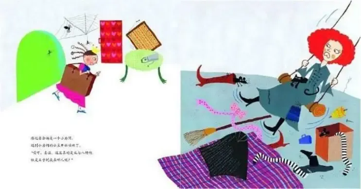 乱七八糟魔女一直在大喊大叫,但是公主还是忙着打扫卫生。除掉蜘蛛网、擦掉灰尘,把乱七八糟堆一起的东西也放回了原地。然后用彩色珠子把魔女的头发扎了起来,还在黑色的披肩上别上了漂亮的珠子。把头发梳得的整整齐齐之后照镜子,乱七八糟的魔女变成了漂亮的公主。