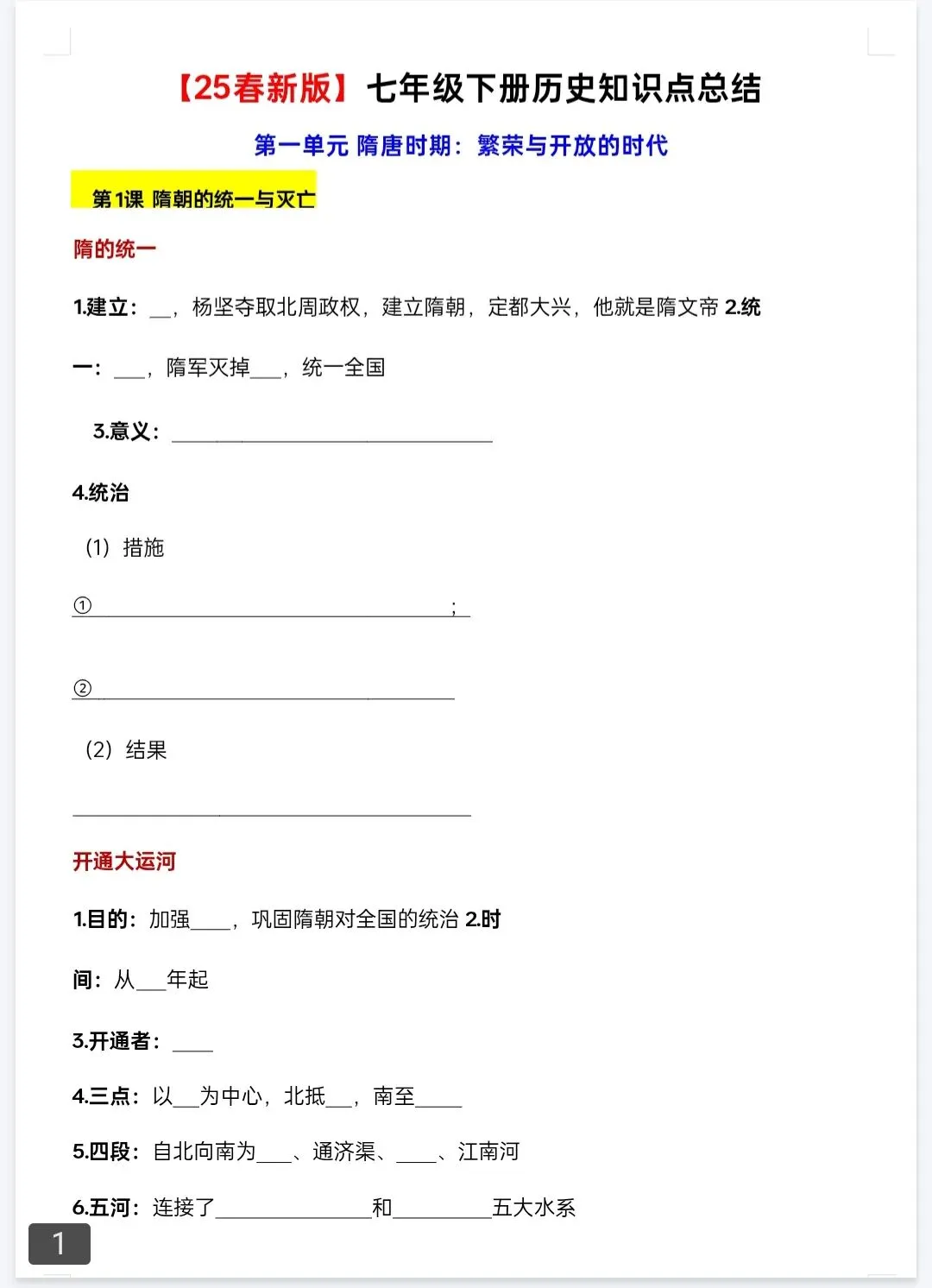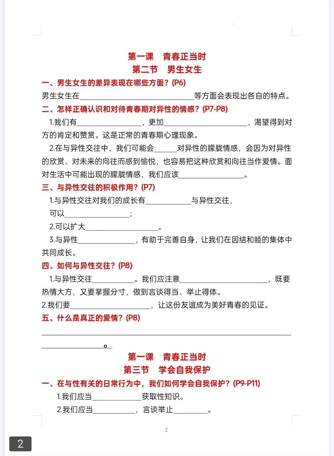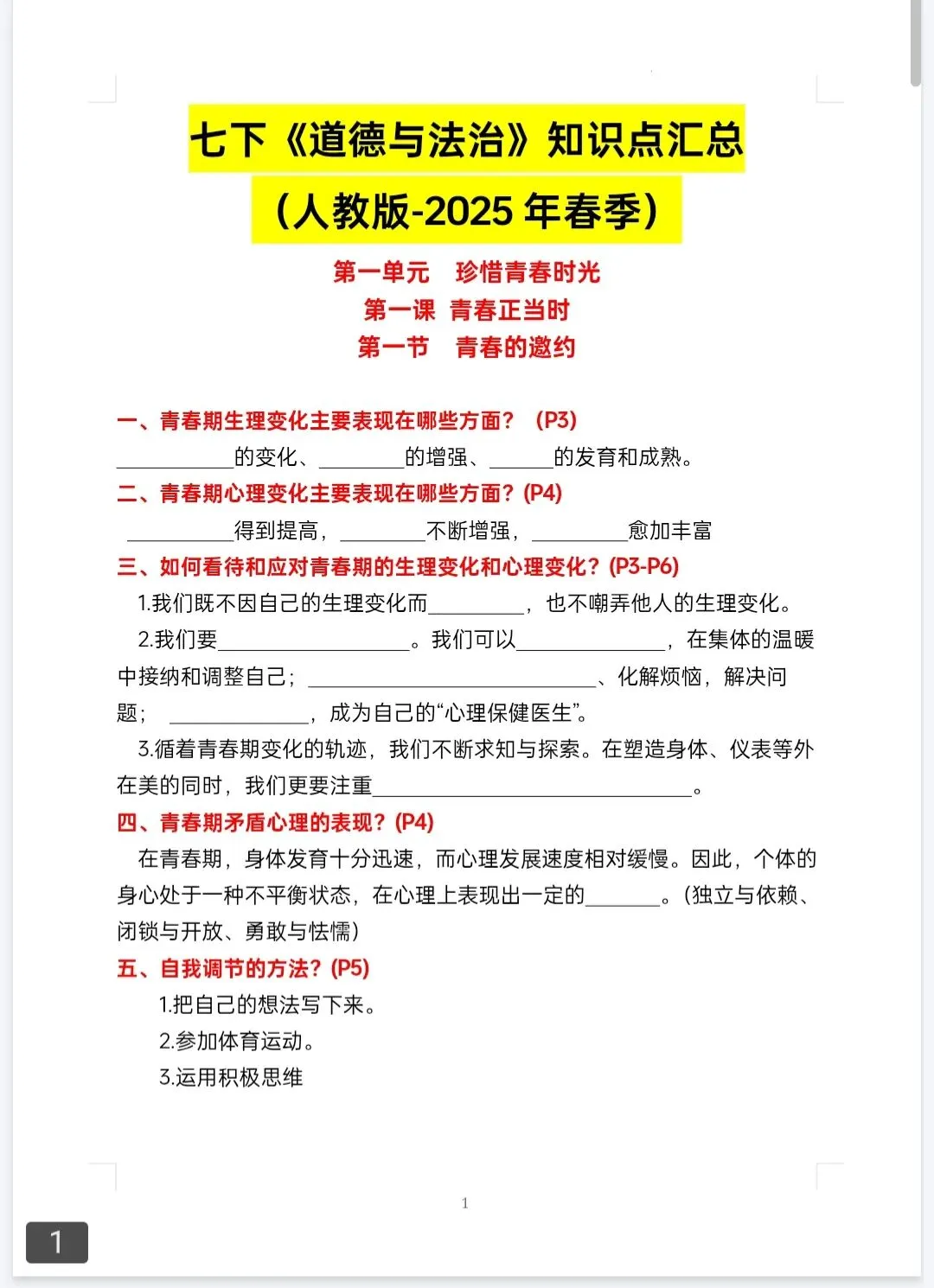 今天给大家分享的是26春初中小四门七年级下知识点汇总 电子版高清可打印,供各位老师提前备课新学期使用!