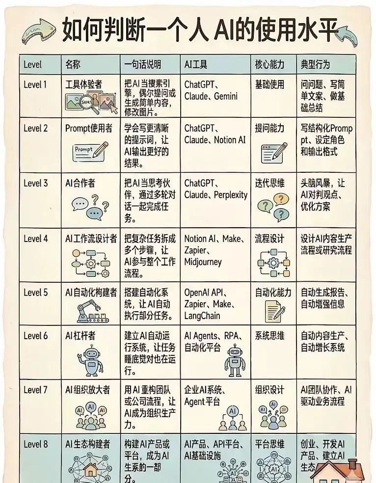 从工具到生态:一张图看懂AI使用能力的8个层级,你到第几级了?