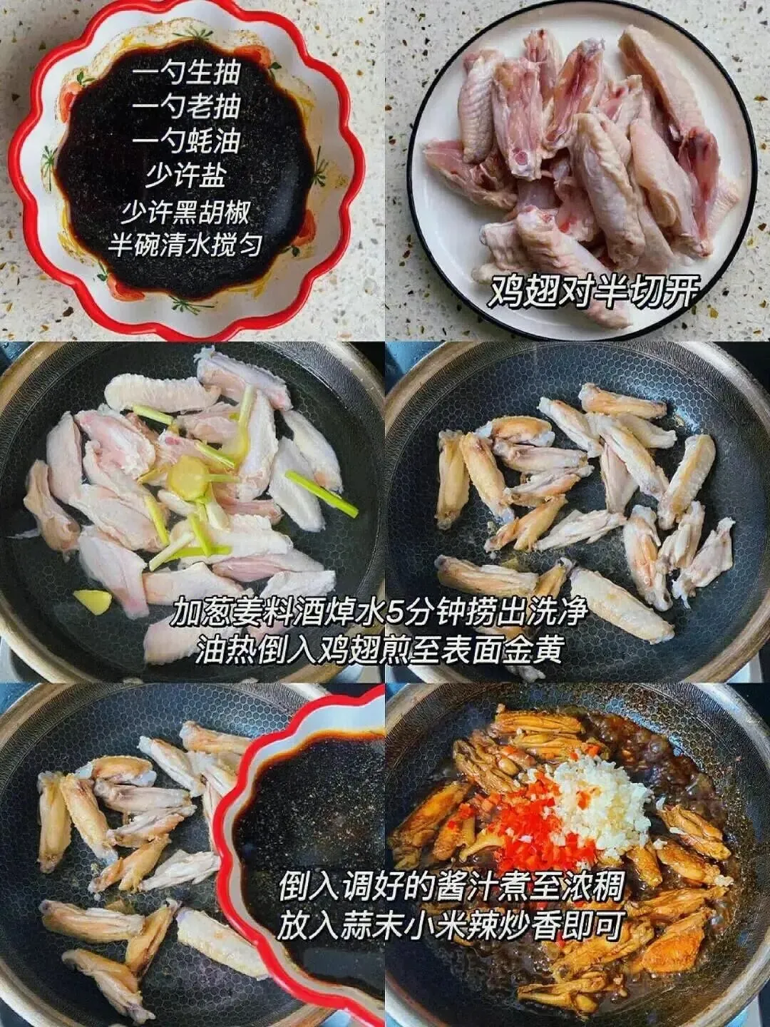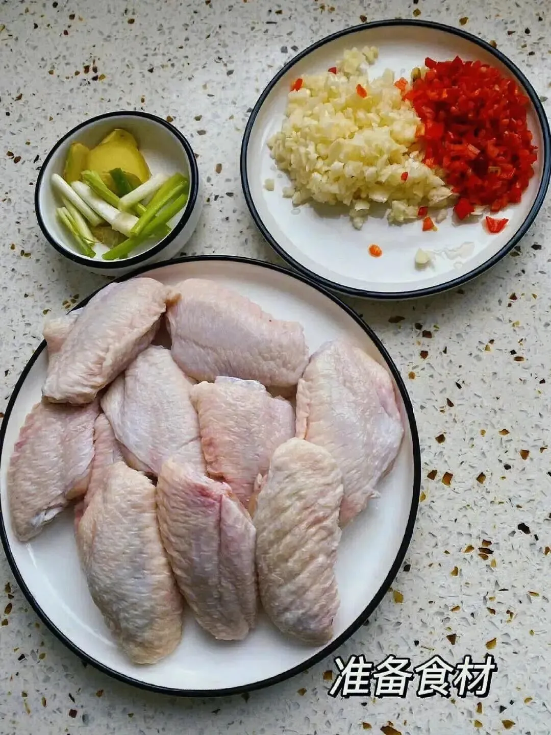 鸡翅、葱姜片、生抽、老抽、蚝油、盐、黑胡椒、清水、蒜末、小米辣