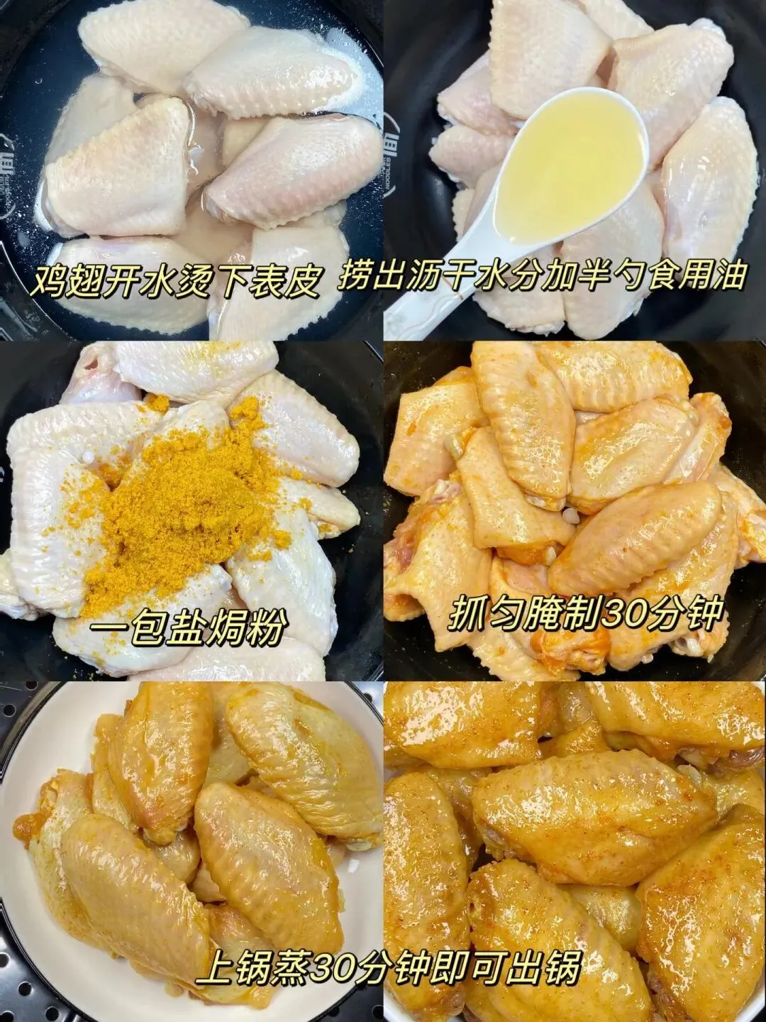 1. 鸡翅开水烫下表皮,捞出沥干水分,加半勺食用油、一包盐焗粉抓匀腌制30分钟。