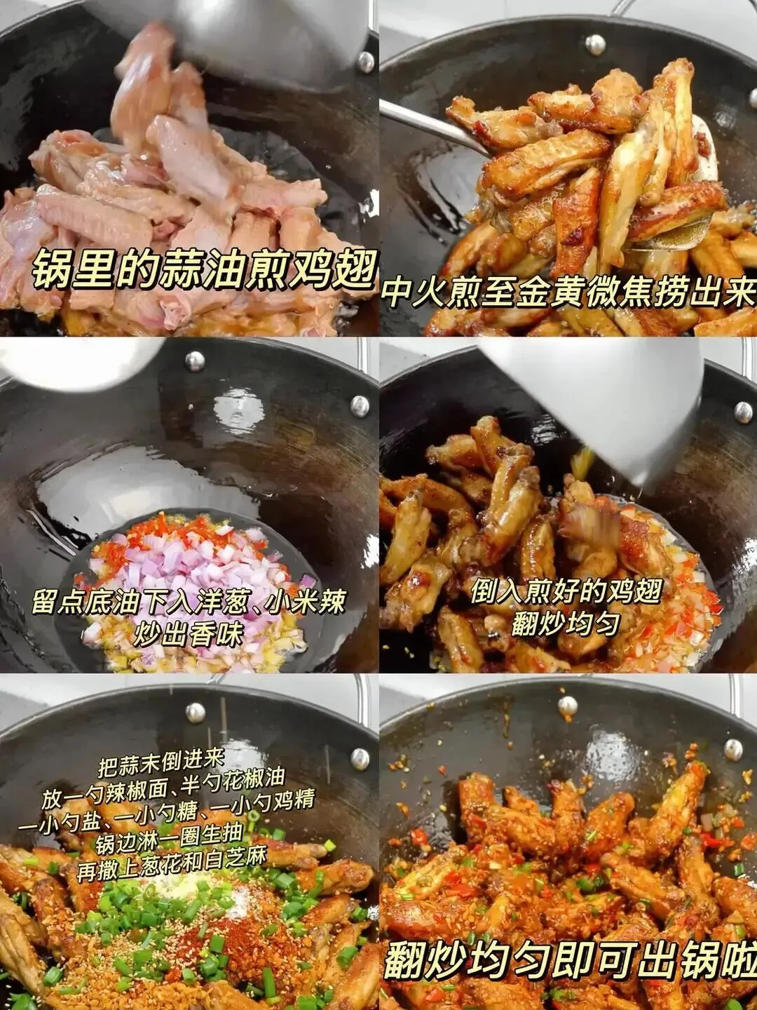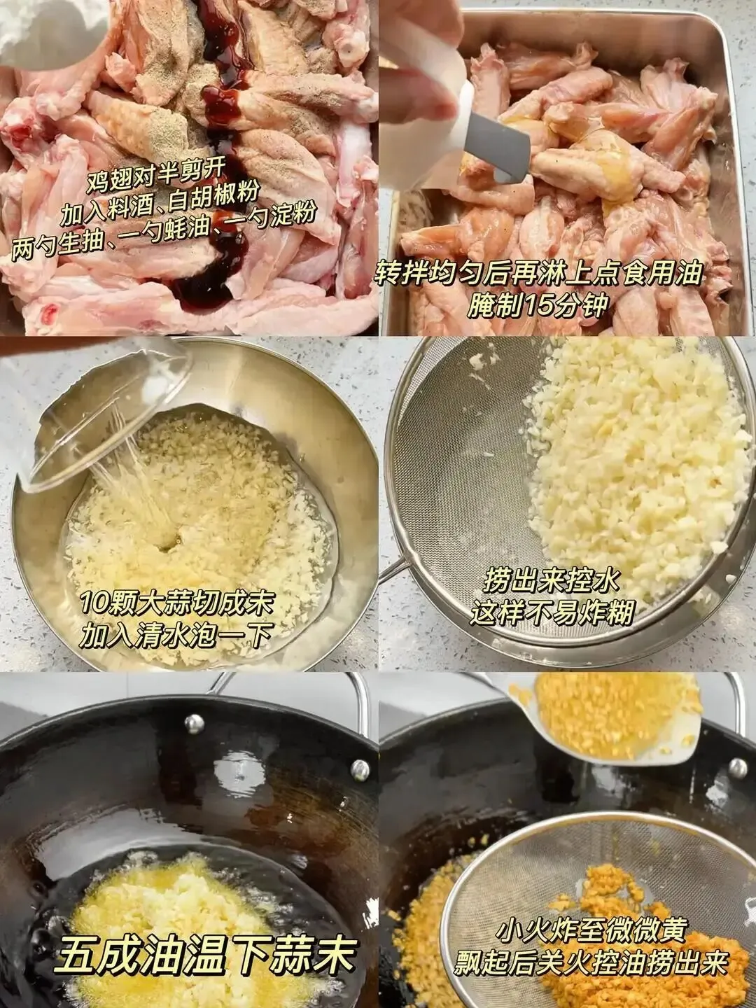 2: 准备10颗紫皮大蒜打碎后用清水泡一下,泡过的大蒜不容易炸糊,油温五成热,下入蒜末,保持小火炸,看到蒜微微变黄,都飘起来了就立即关火,这样炸出来的口感刚刚好;3:锅里的蒜油继续来煎鸡翅,用中火慢煎,两面金黄微焦就盛出备用。