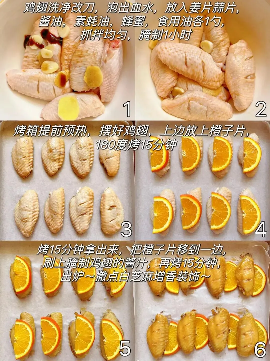 2,烤箱180度提前预热,烤盘上摆好鸡翅,鸡翅上放橙子片,先烤15分钟;