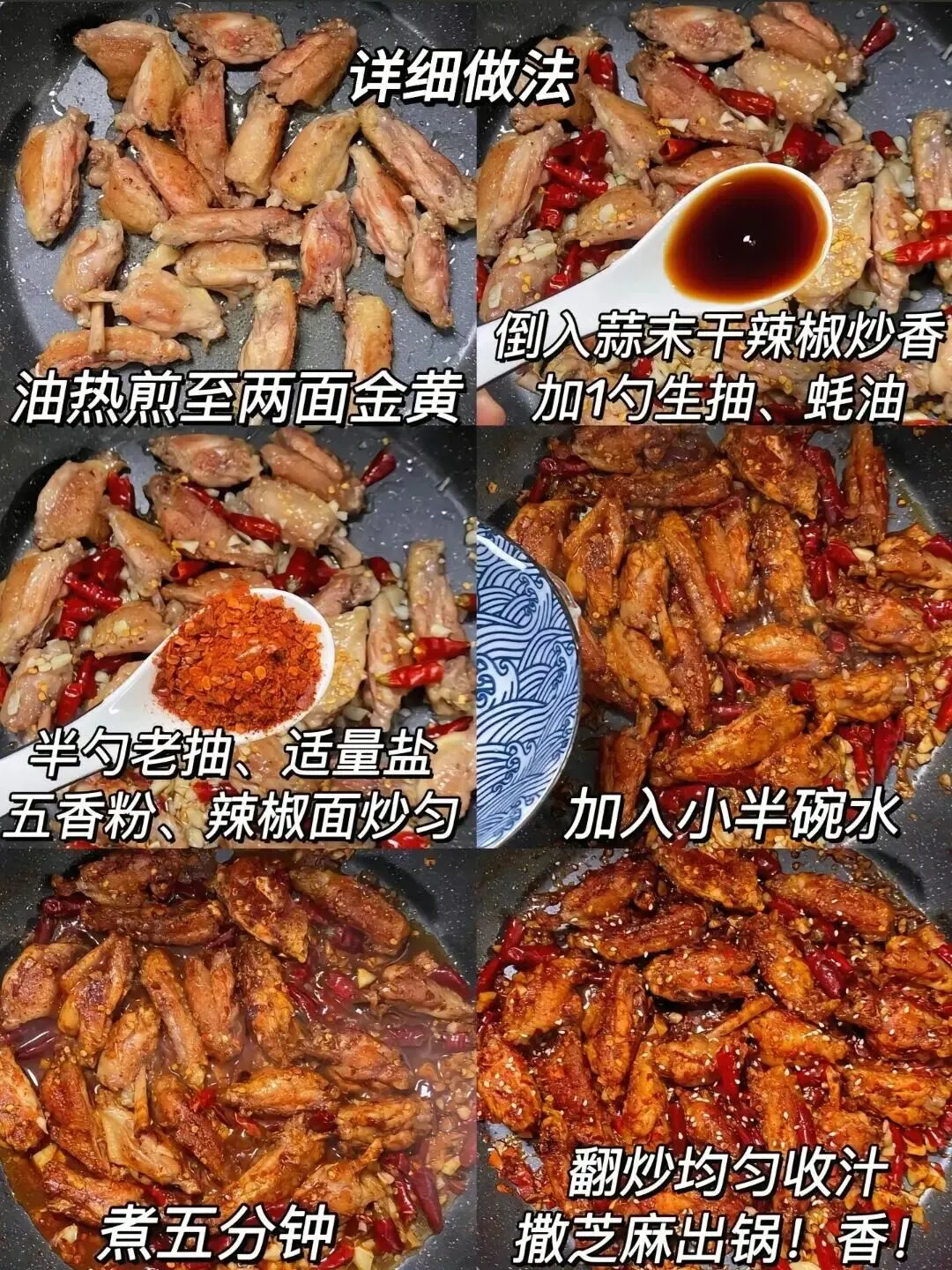 1. 油热煎鸡翅至两面金黄,倒入蒜末、干辣椒炒香,加1勺生抽、蚝油,半勺老抽、适量盐、五香粉、辣椒面炒匀。