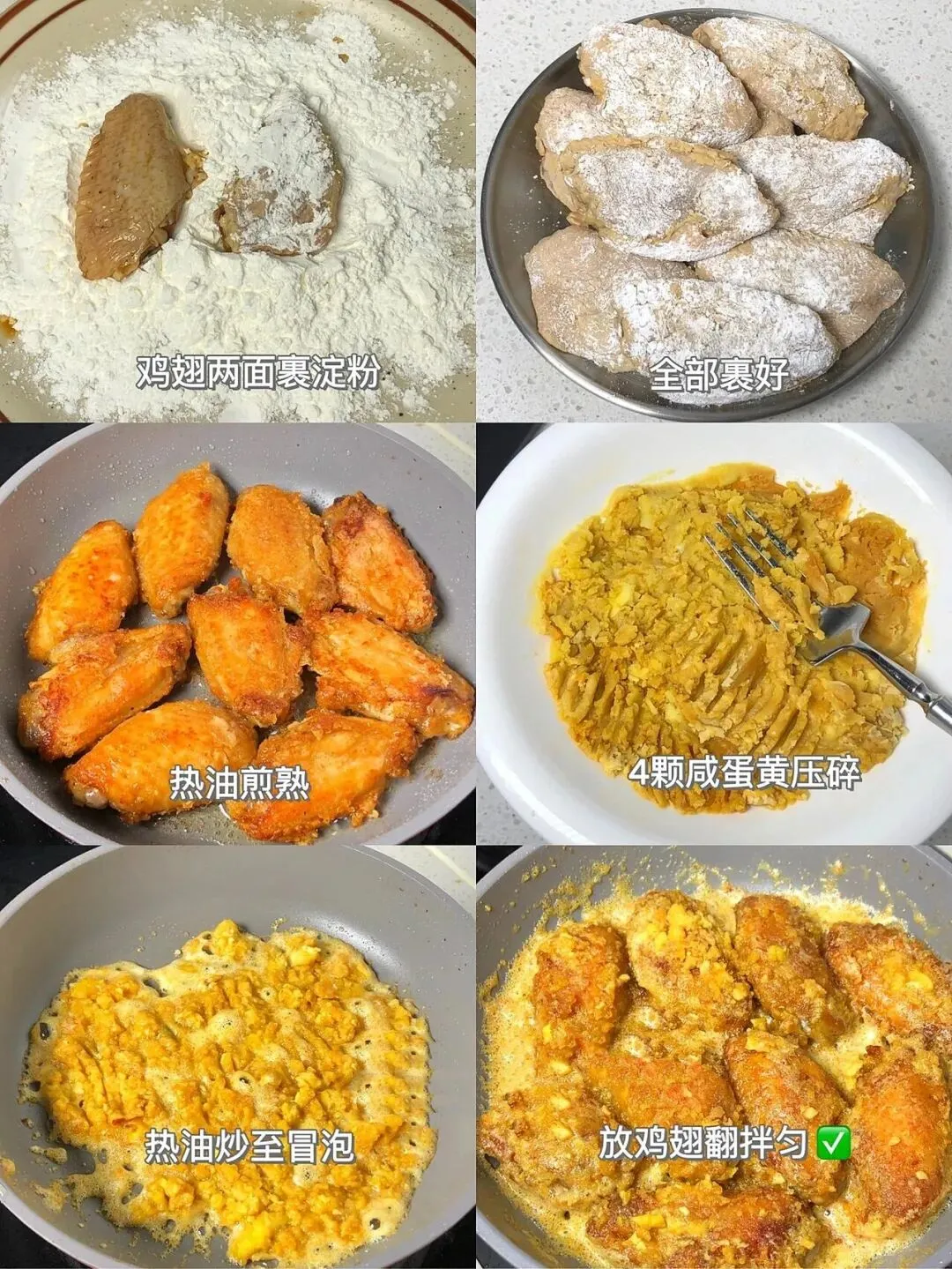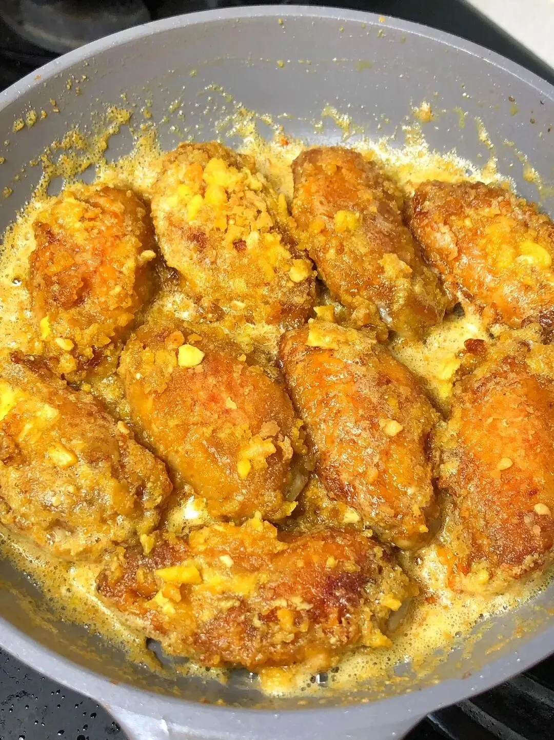 3. 热油将鸡翅煎熟,4颗咸蛋黄压碎,热油炒至冒泡。