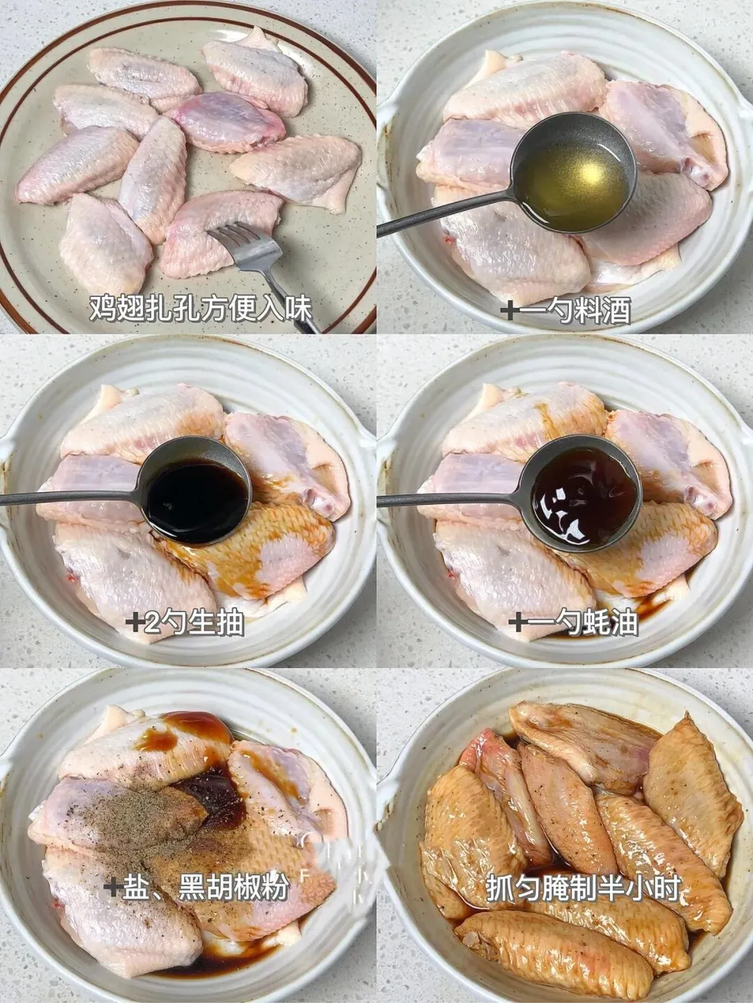 1. 鸡翅扎孔,加1勺料酒、2勺生抽、1勺蚝油、盐和黑胡椒粉抓匀腌制半小时。