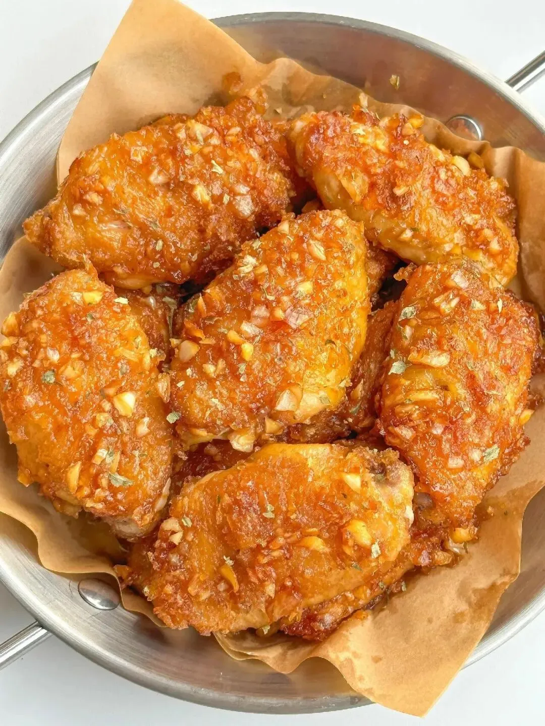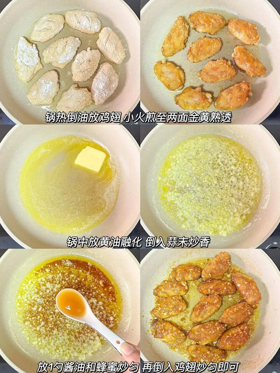 3. 锅中放黄油融化,倒入蒜末炒香,加入1勺酱油和蜂蜜炒匀,再放入煎好的鸡翅翻炒均匀即可。