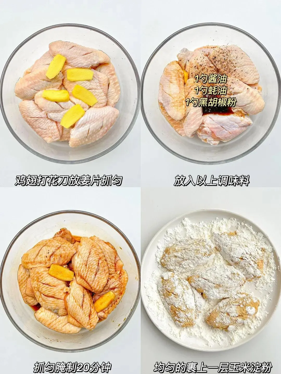 做法:1:鸡翅清洗干净,对半剪开,放入大碗里加入料酒➕白胡椒粉➕两勺生抽➕一勺蚝油➕一勺淀粉,抓拌均匀入个底味,抓拌均匀以后,再来点食用油,腌制15分钟;