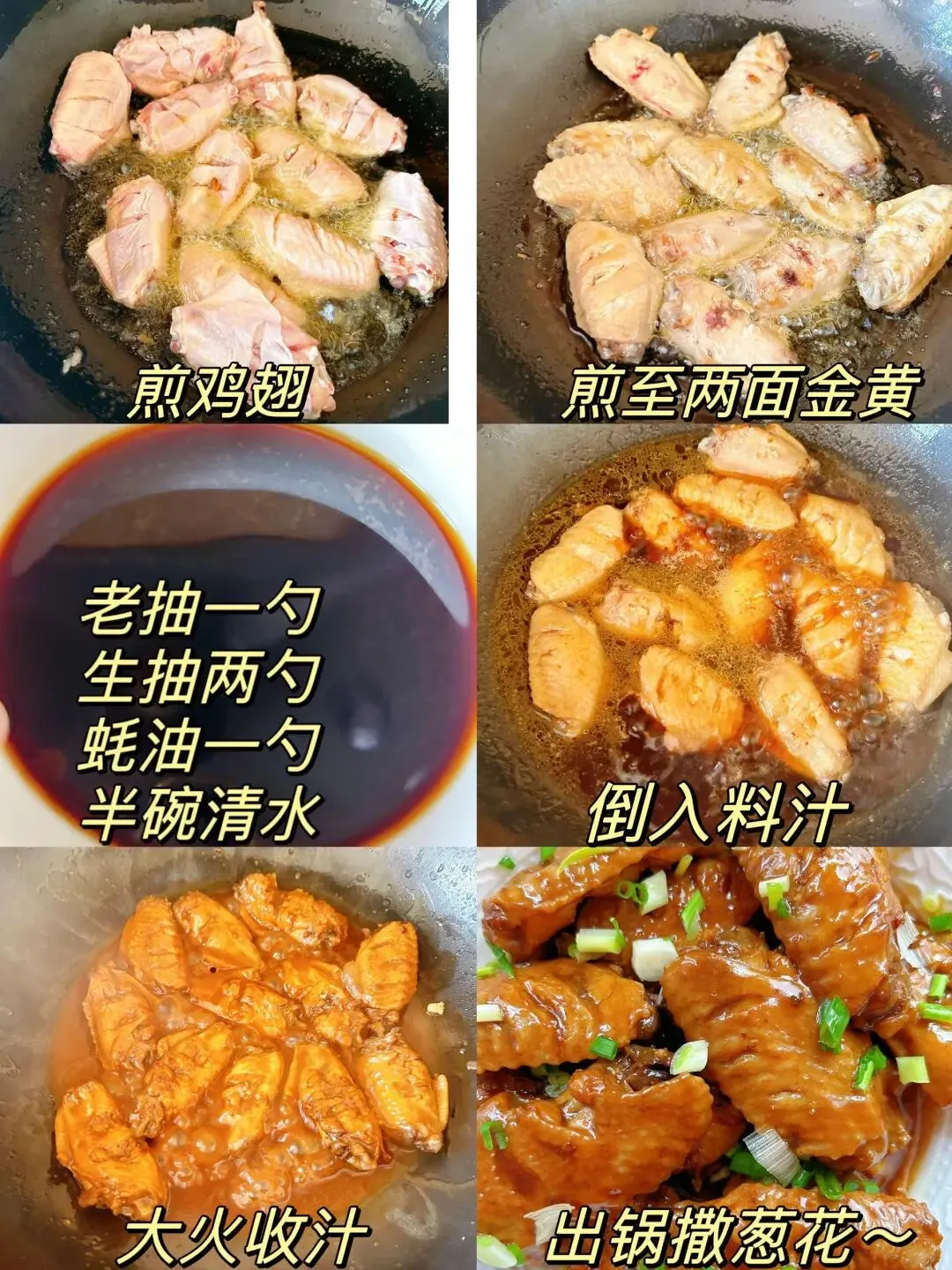 1,煎鸡翅至两面金黄,混合1勺老抽、2勺生抽、1勺蚝油、半碗清水制成料汁,