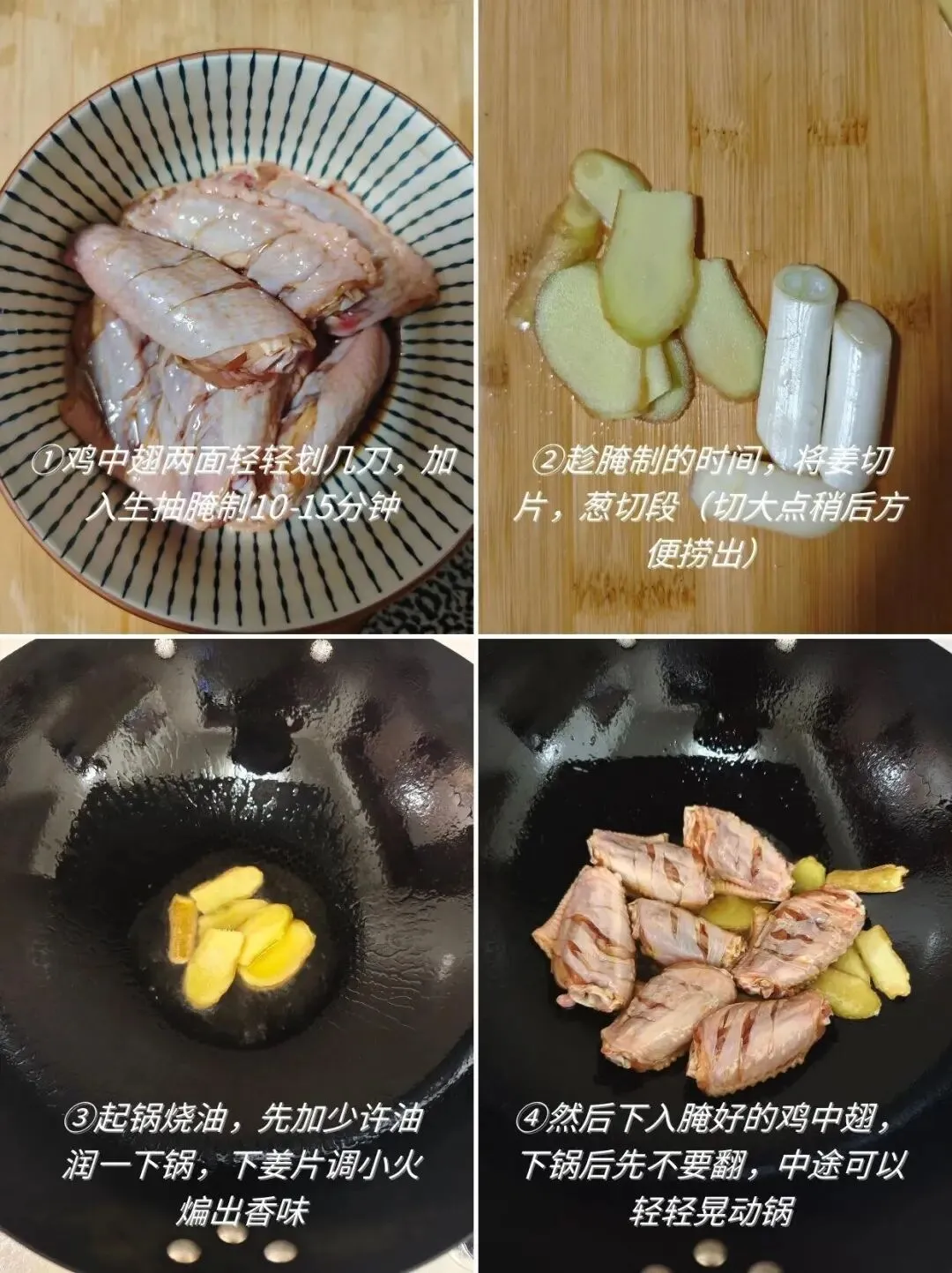 做法:1,鸡中翅两面轻轻划几刀(也可以不划,我觉得这样会更入味一些),加入生抽腌制10-15分钟,趁腌制的时间,将姜切片,葱切段(可以稍微切大点,方便后边挑)。