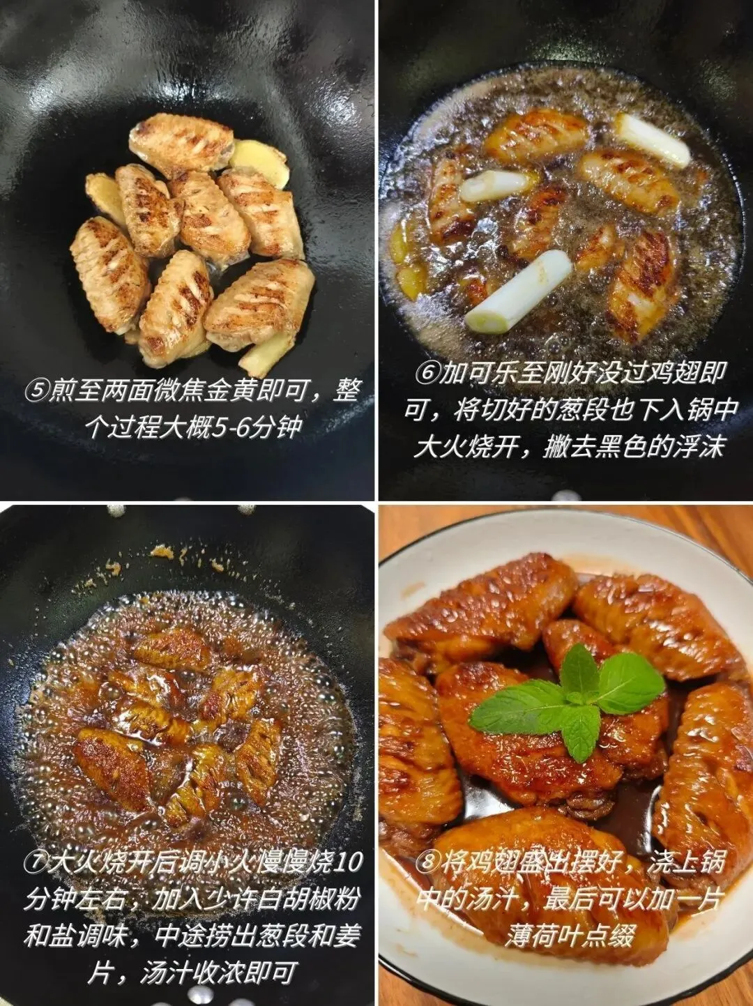 3,鸡翅两面煎至金黄后往锅中加可乐,刚好没过鸡翅就行,再加葱段,开大火烧开,中途用勺子撇去黑色的浮沫,然后加少许白胡椒粉和盐调味,感觉颜色不够的话可以再加点老抽,调小火慢慢烧制10分钟左右,汤汁收浓即可。