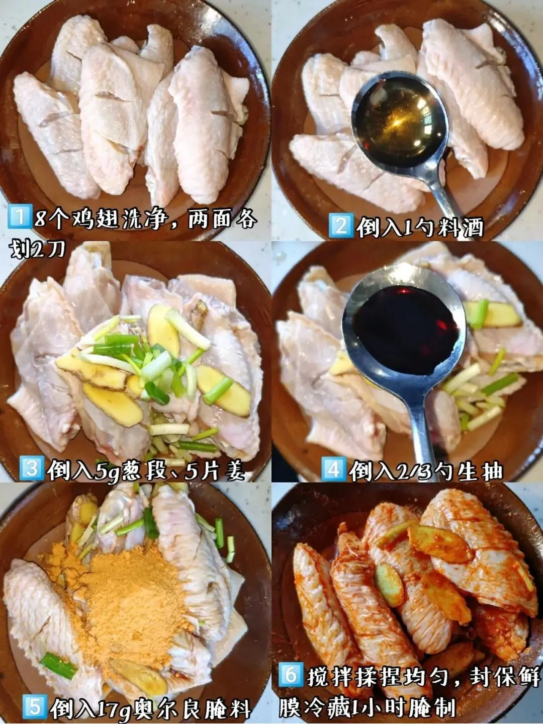 1. 8个鸡翅洗净两面各划2刀,加1勺料酒、5g葱段、5片姜、2/3勺生抽、17g奥尔良腌料,搅拌揉捏均匀,封保鲜膜冷藏1小时腌制。