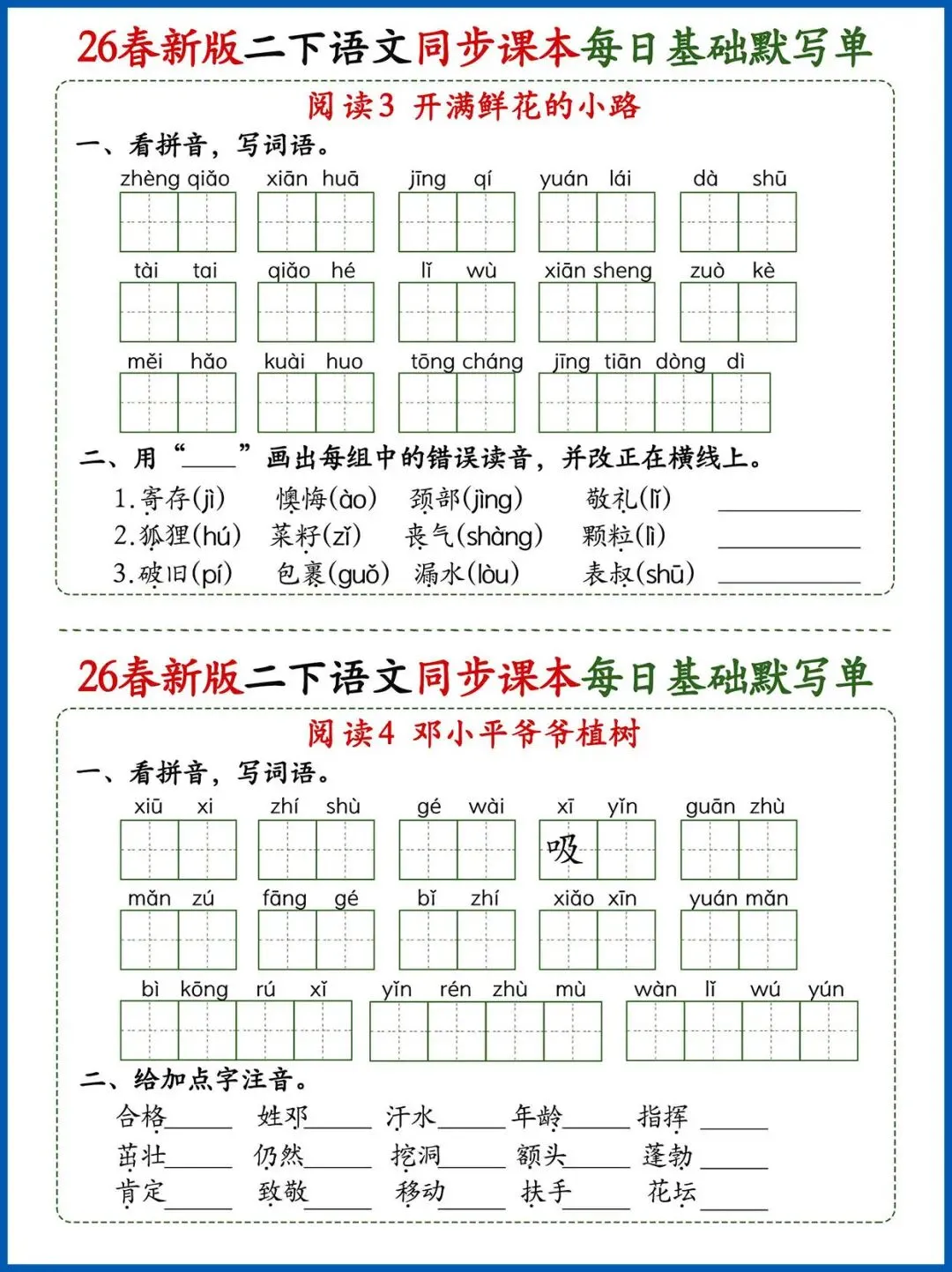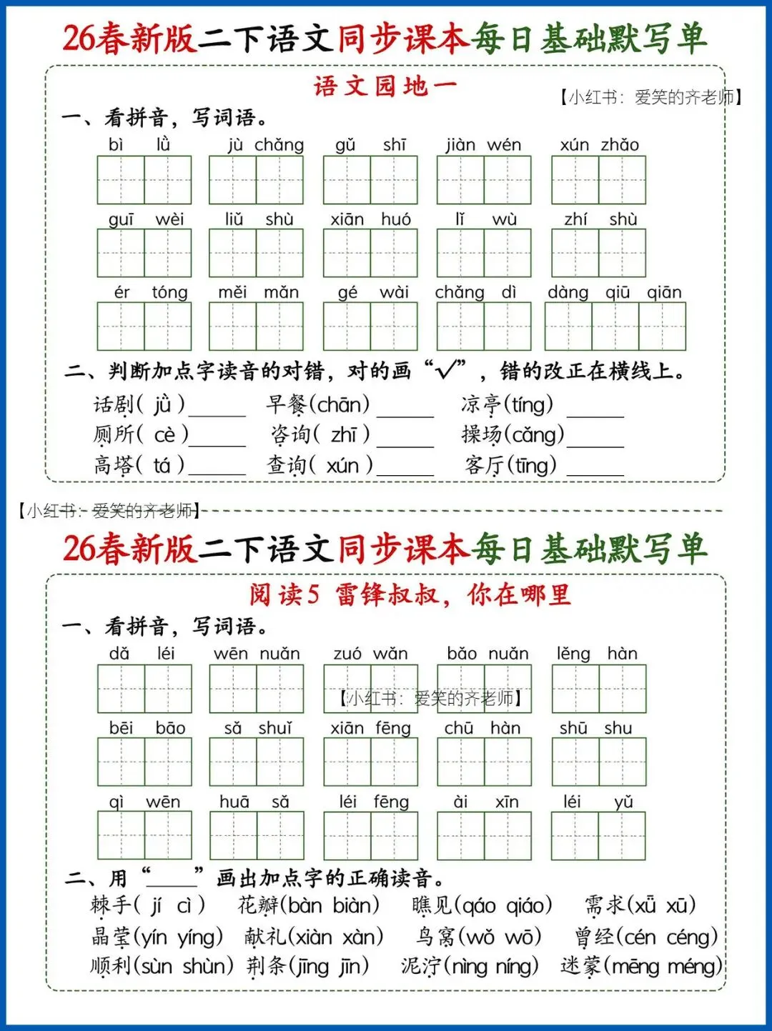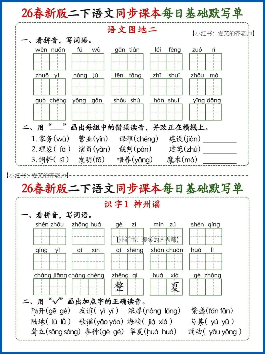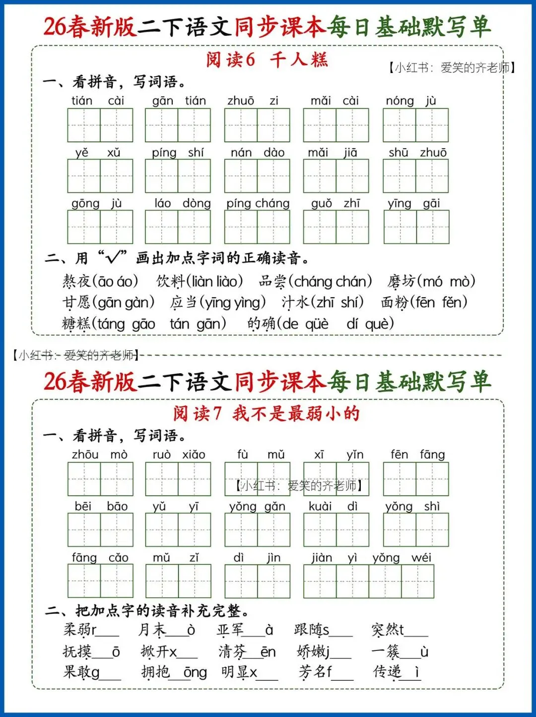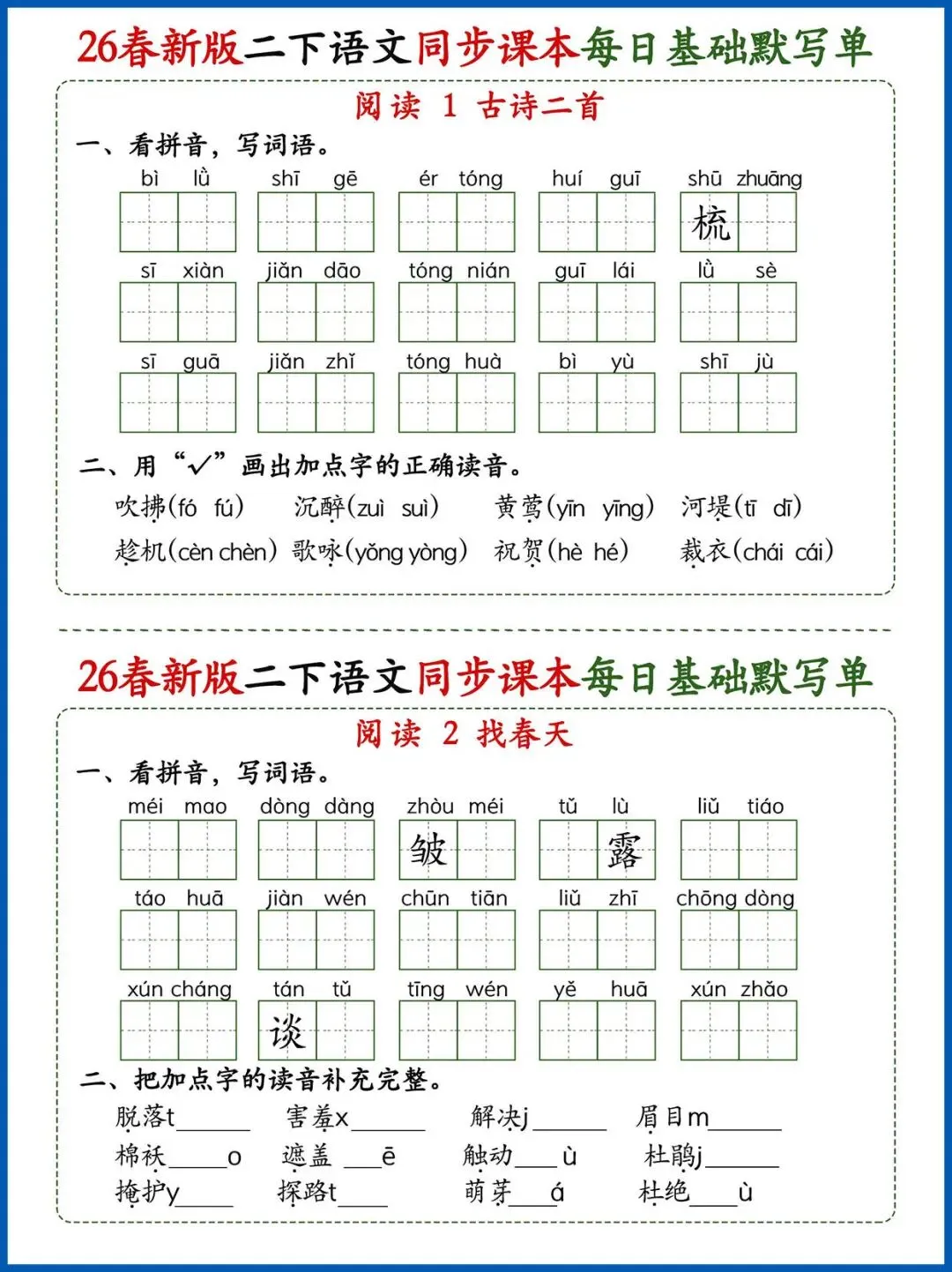 26春部编版二年级下册语文1-8单元重要考点默写单(空白+答案)全册每日一练小纸条(默写小能手)可打印