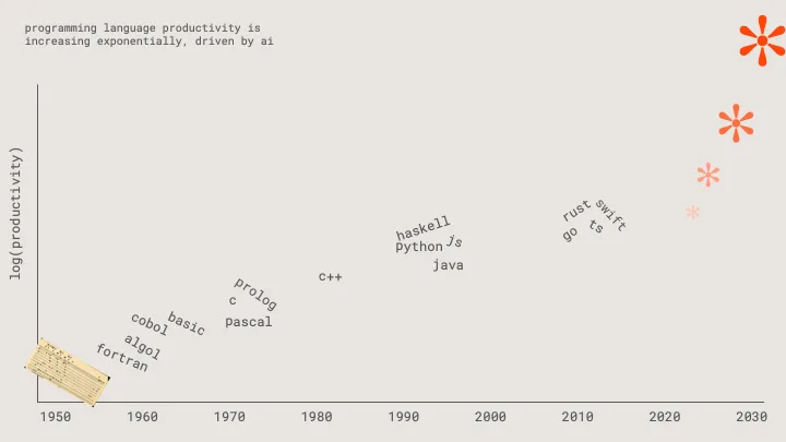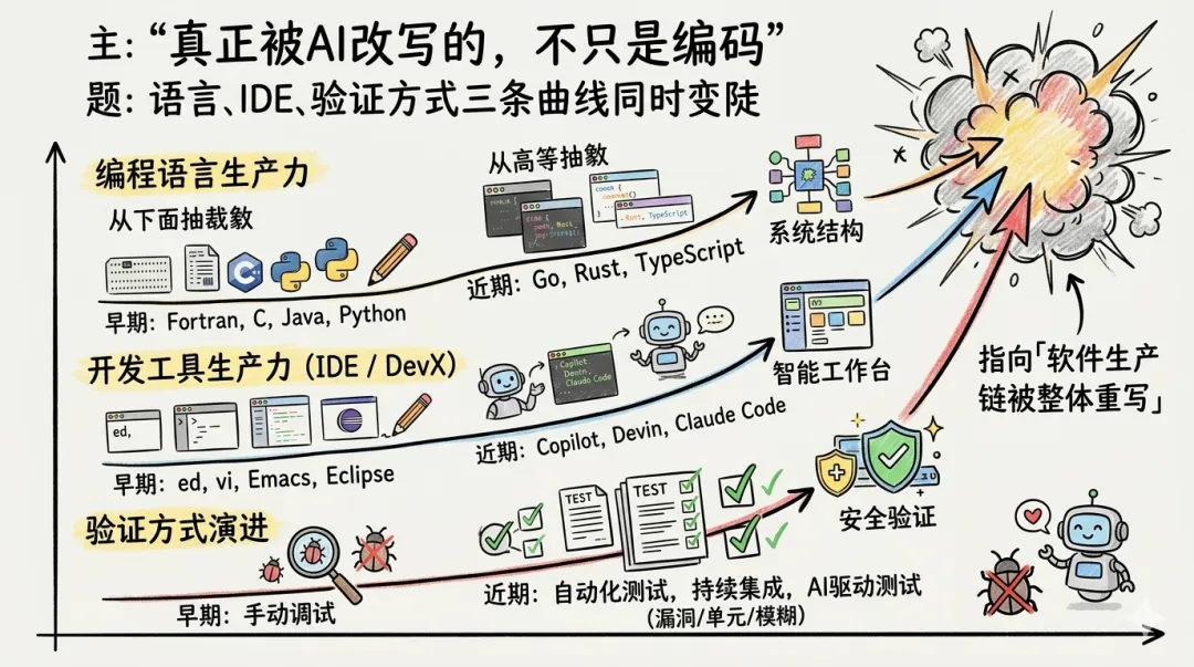 第一条,是编程语言的生产力曲线。从 Fortran、C、Java、Python,到 Go、Rust、TypeScript,抽象层越来越高,甚至从命令式编程向声明式编程演进,开发者能用更少的心智负担组织更复杂的系统。