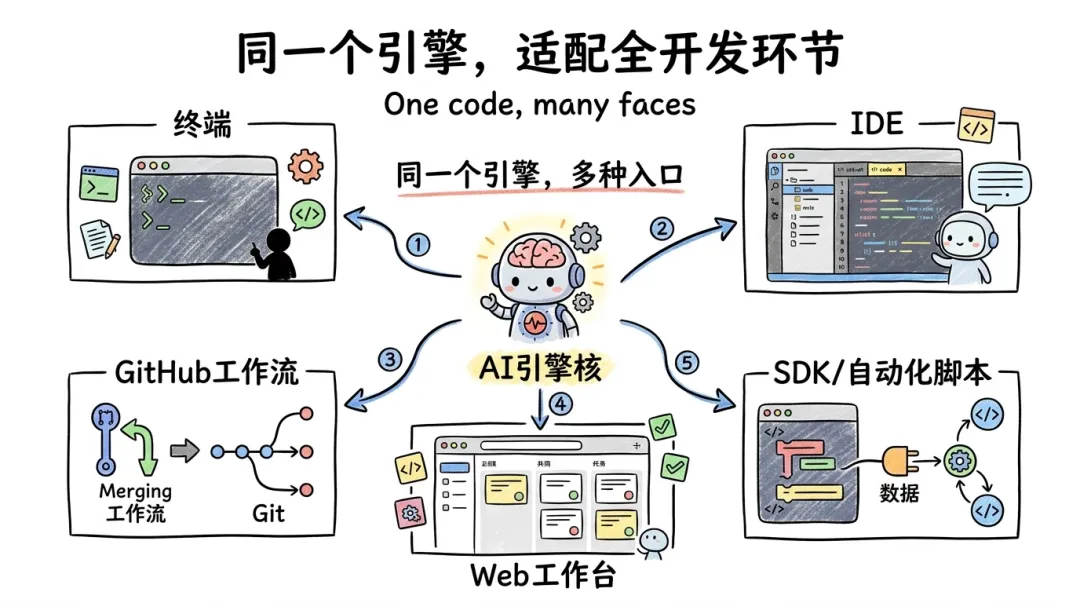 图4:One code, many faces 机制图。建议画成一个中心引擎向五个入口发散:终端、IDE、GitHub、Web、SDK。图注:不是多平台适配,而是同一个智能体引擎适配不同开发环节