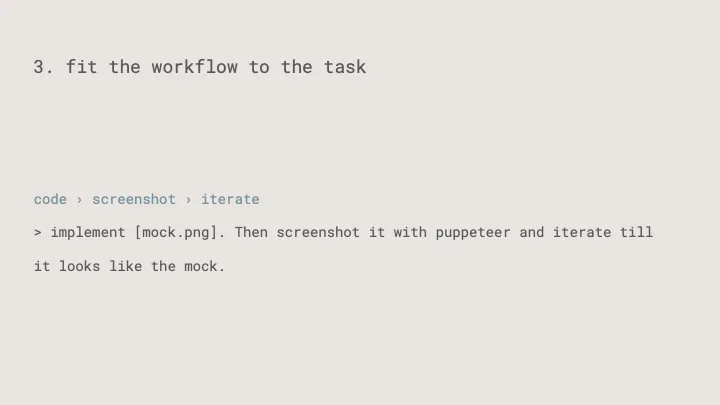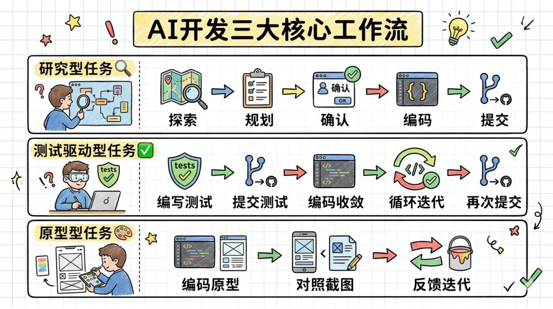 第二,按任务类型设计 AI 开发工作流。排查根因,用「探索→规划→确认→编码」。补能力边界,用「测试→提交→编码→迭代」。做前端原型,用「代码→截图→迭代」。不要所有事情都只会「问一句,改一轮」。