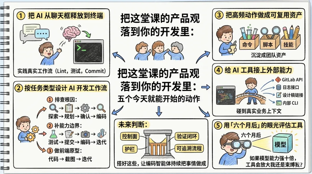 这一讲中最宝贵的内容是 Boris 和 Claude Code 的产品观。你不需要先把所有工具全换掉。你先把以下五个动作做起来,就已经是在往对的方向走了。