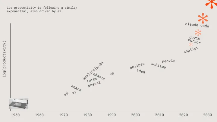 第二条,是 IDE / DevX 的生产力曲线。从 ed、vi、Emacs、Eclipse,到 Copilot、Devin、Claude Code,工具不再只是编辑器,而开始接管越来越长的任务片段。