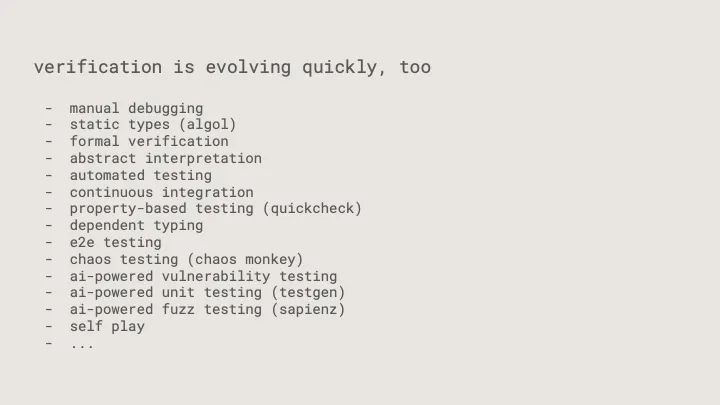 第三条,是验证方式的演进曲线。从手动调试、静态类型、自动化测试、持续集成,一路扩展到 AI 驱动的漏洞测试、AI 驱动的单元测试、AI 驱动的模糊测试。