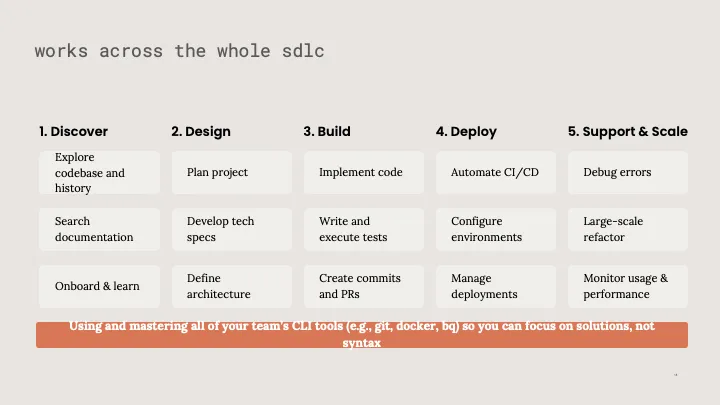 它能不能理解代码库;能不能拉 Git 历史;能不能搜索文档;能不能跑测试;能不能接 CLI 命令行界面;能不能进入 PR、部署、自动化这些真实流程。