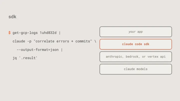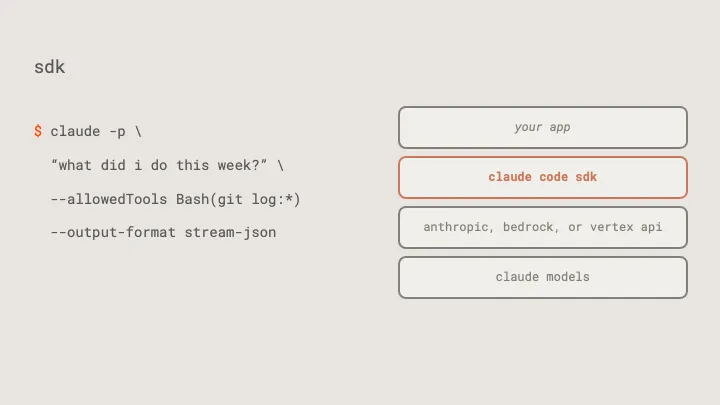 Claude Code 不只有终端。它还有 SDK,也就是软件开发工具包;还有程序化调用,比如 claude -p 这种非交互调用,本质上就是可以直接嵌进脚本和自动化流程里的调用方式。