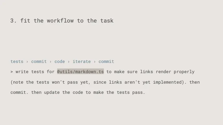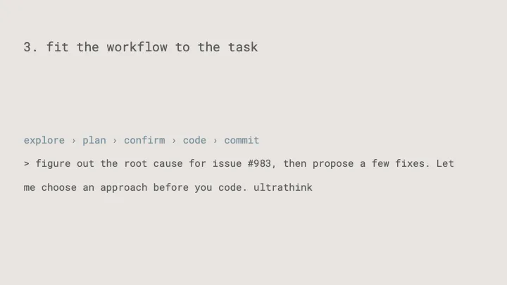 研究型任务🔍:explore → plan → confirm → code → commit 测试驱动型任务✅:tests → commit → code → iterate → commit 原型型任务🎨:code → screenshot → iterate
