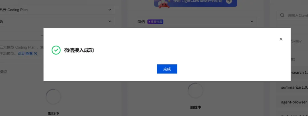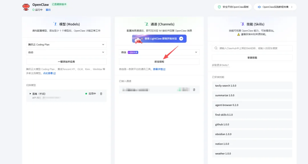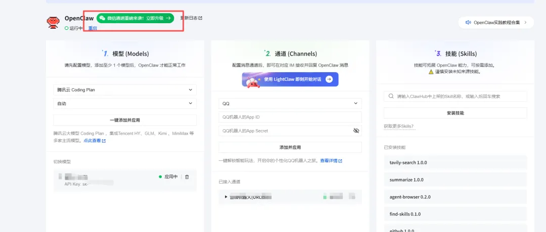 腾讯云控制台→Lighthouse实例→应用管理→更新到最新版→微信通道→扫码直连