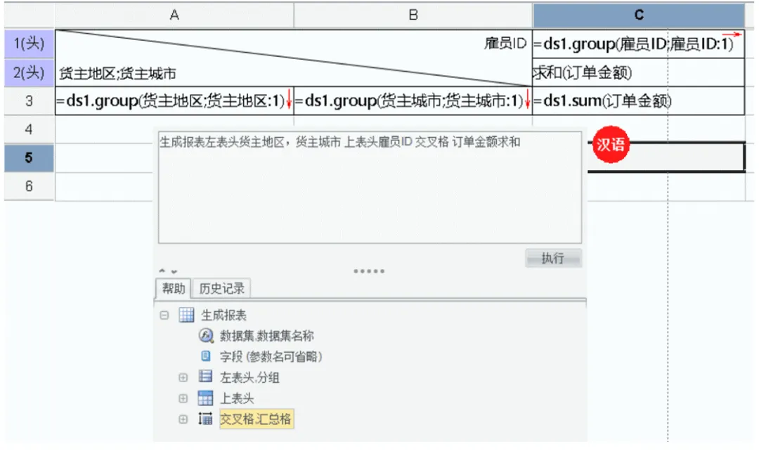 生成报表 左表头 货主地区,货主城市 上表头 雇员 ID 交叉格 订单金额求和