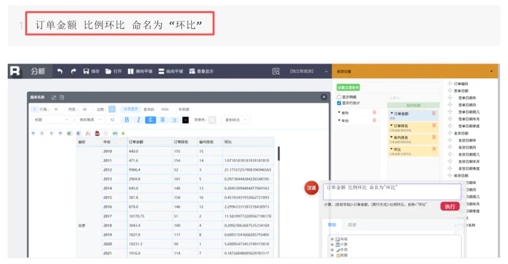 用户不仅可以手动拖拽分析,还可以用自然语言做报表,这就进一步降低了用户的使用难度,增加了用户的使用意愿和信心,让软件厂商可以更从容应对了