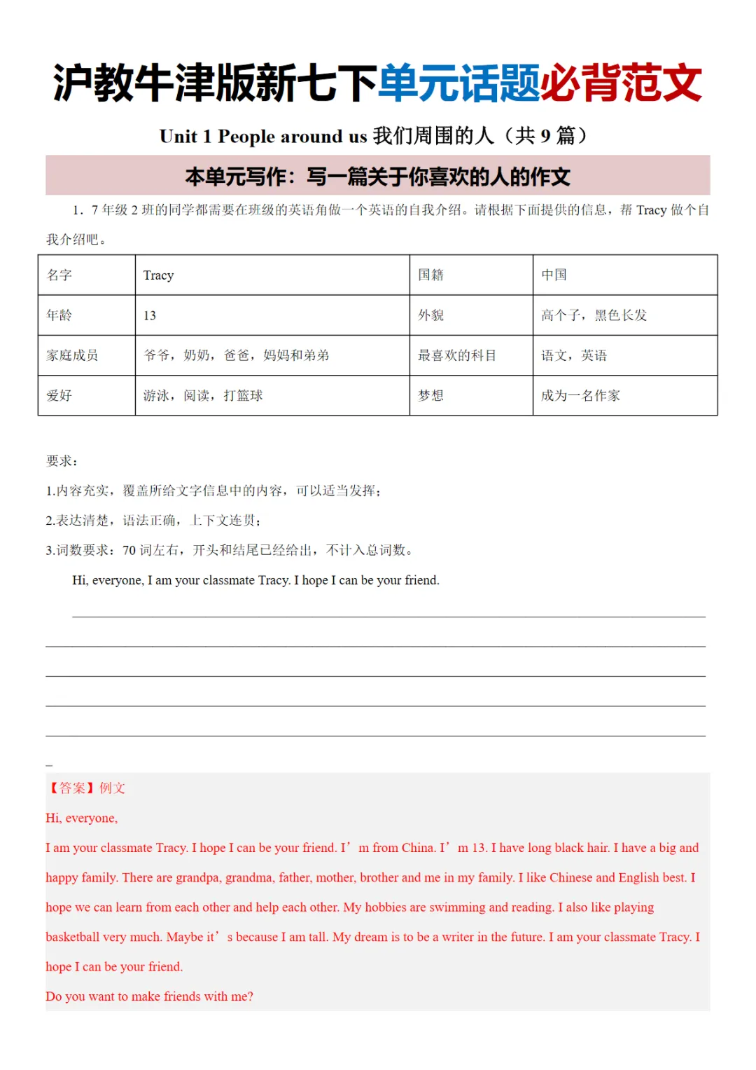【免费下载】Unit 1 People around us我们周围的人-沪教牛津版新七下必背满分范文(教师版),WORD电子版,可编辑,可打印