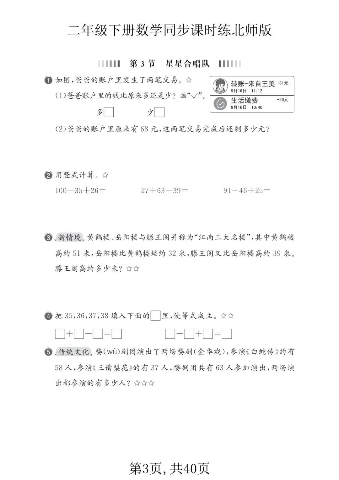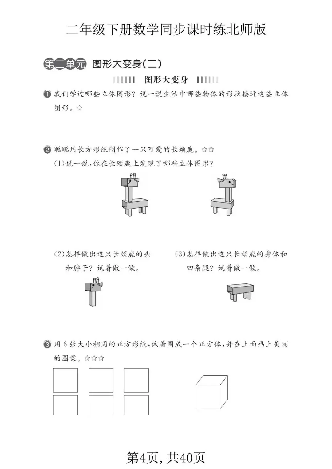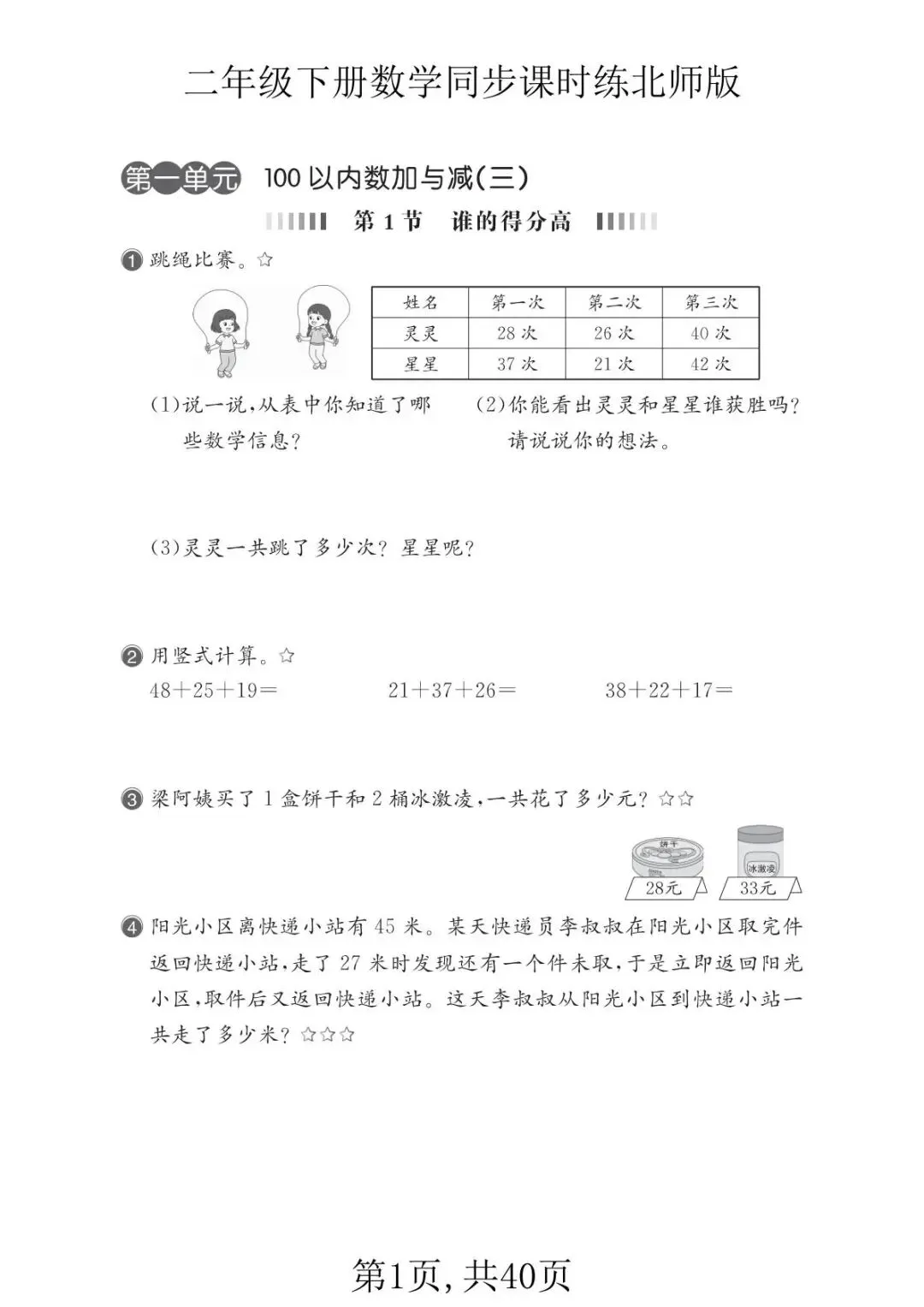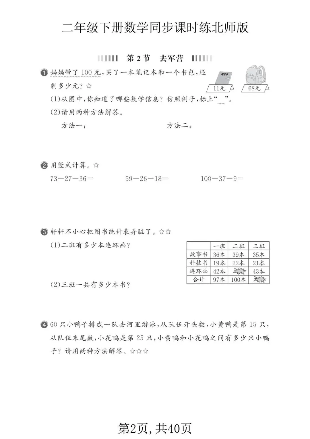 26春北师大版二年级下册数学《同步课本一课一练》,共40页,含答案,可打印.