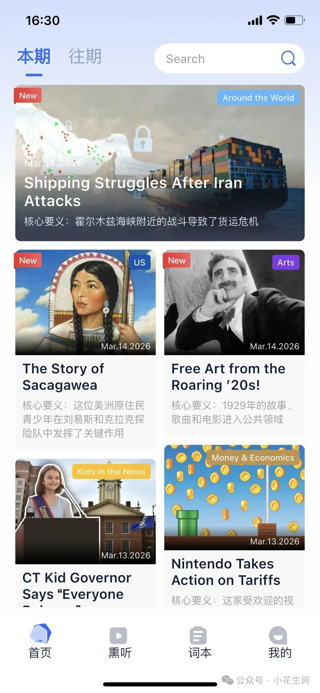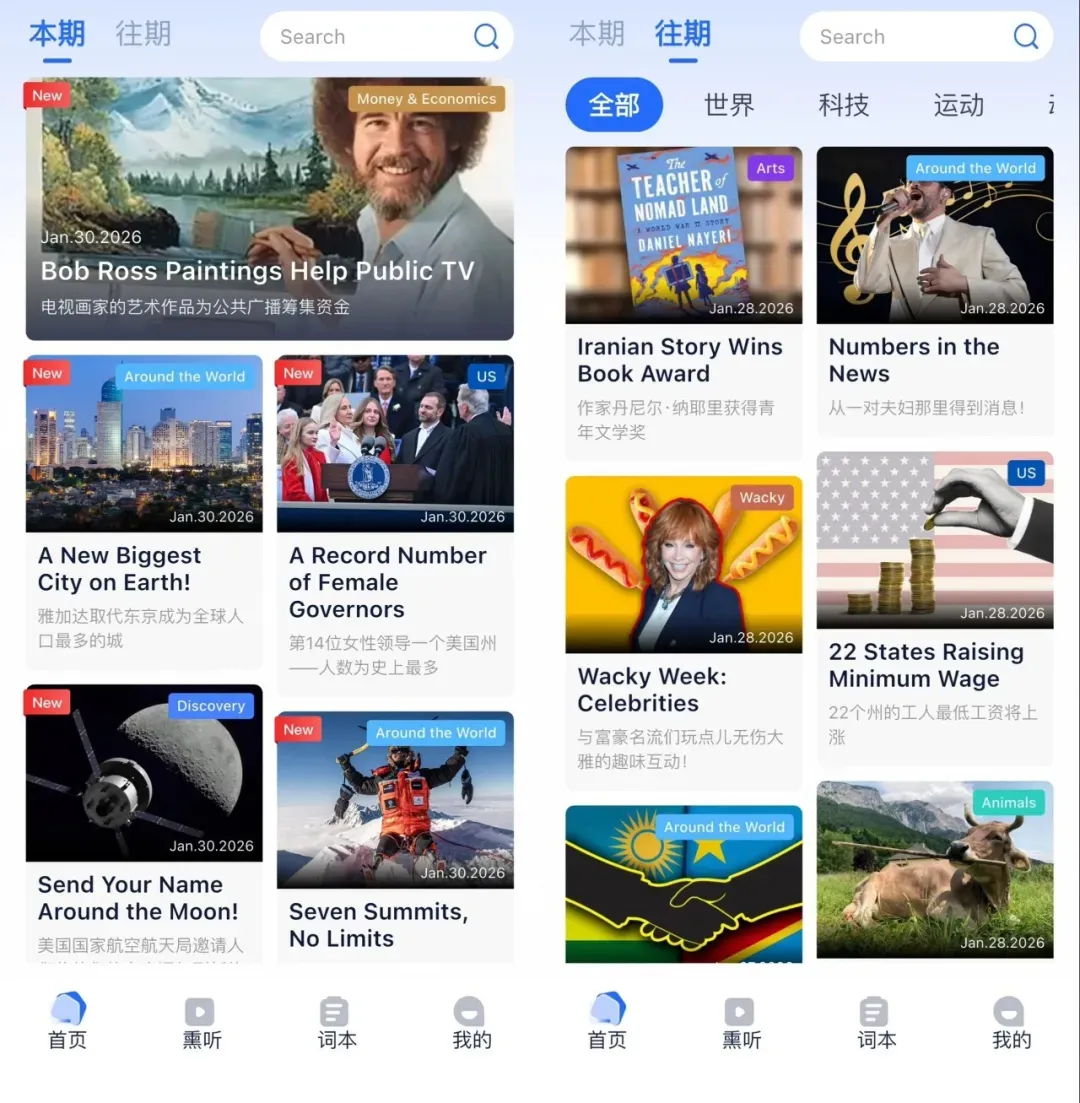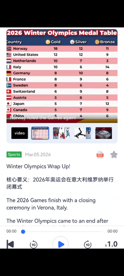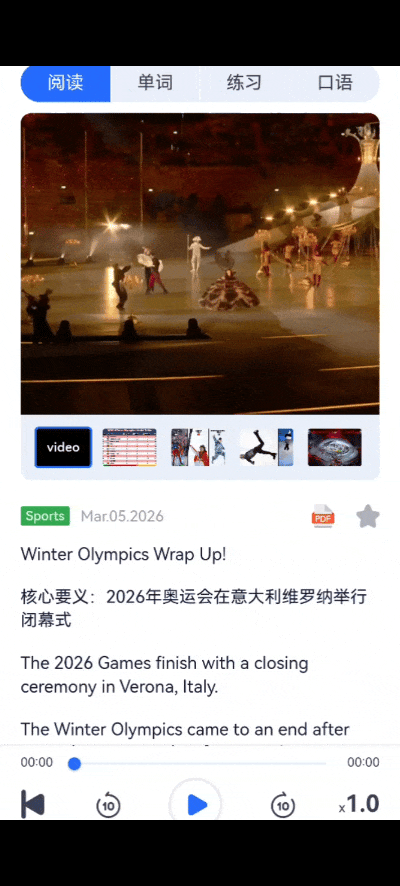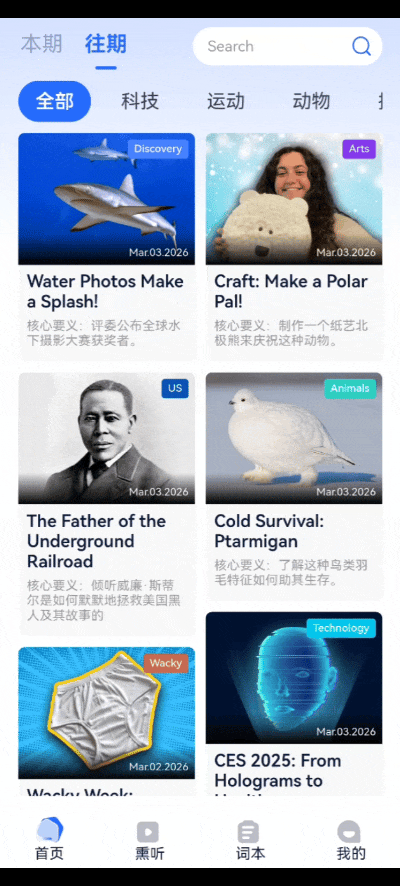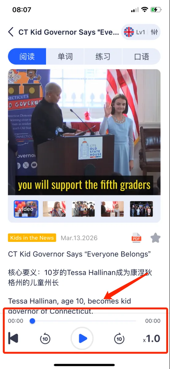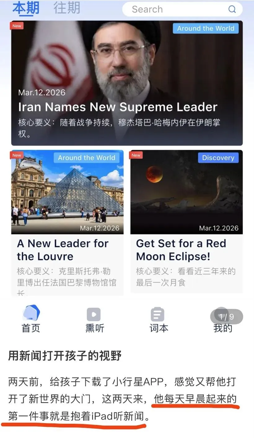 每篇新闻都是母语为英语(北美口音)的专业主播真人录音,能倍速、能定位到文字,碎片时间就能熏听。孩子能把读过的文章随时磨耳朵,当做日常听力。