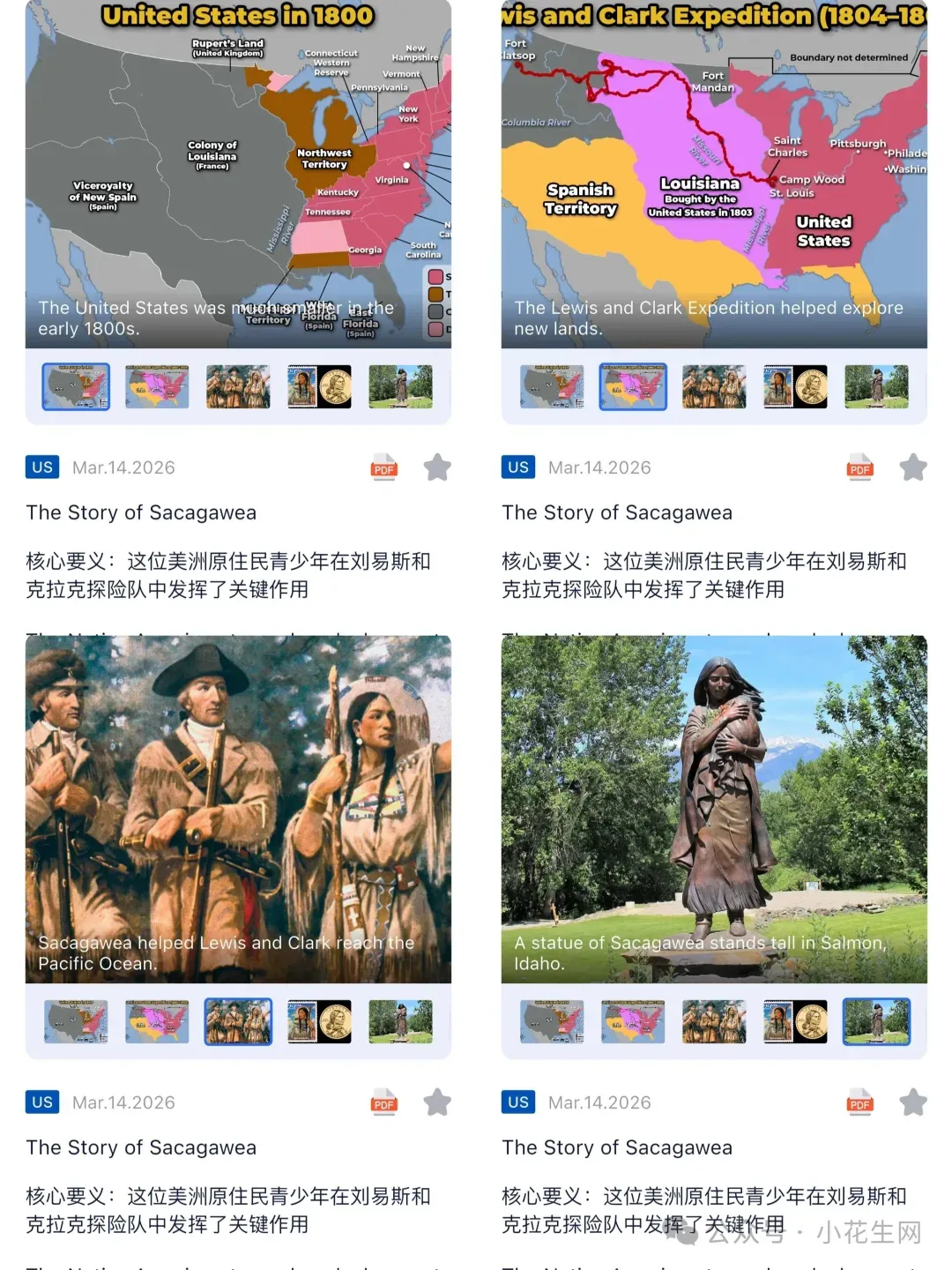 比如,有一篇讲美洲原住民参与探险的故事,前两张图是探险前后的国土面积对比,一眼就能看出变化;后面有张图是那位土著居民的雕塑,怀里还抱着孩子,正好呼应了文中“She brought her baby”这句话。孩子一看图,就大概知道这篇文章在讲什么了,读起来压力小了很多。