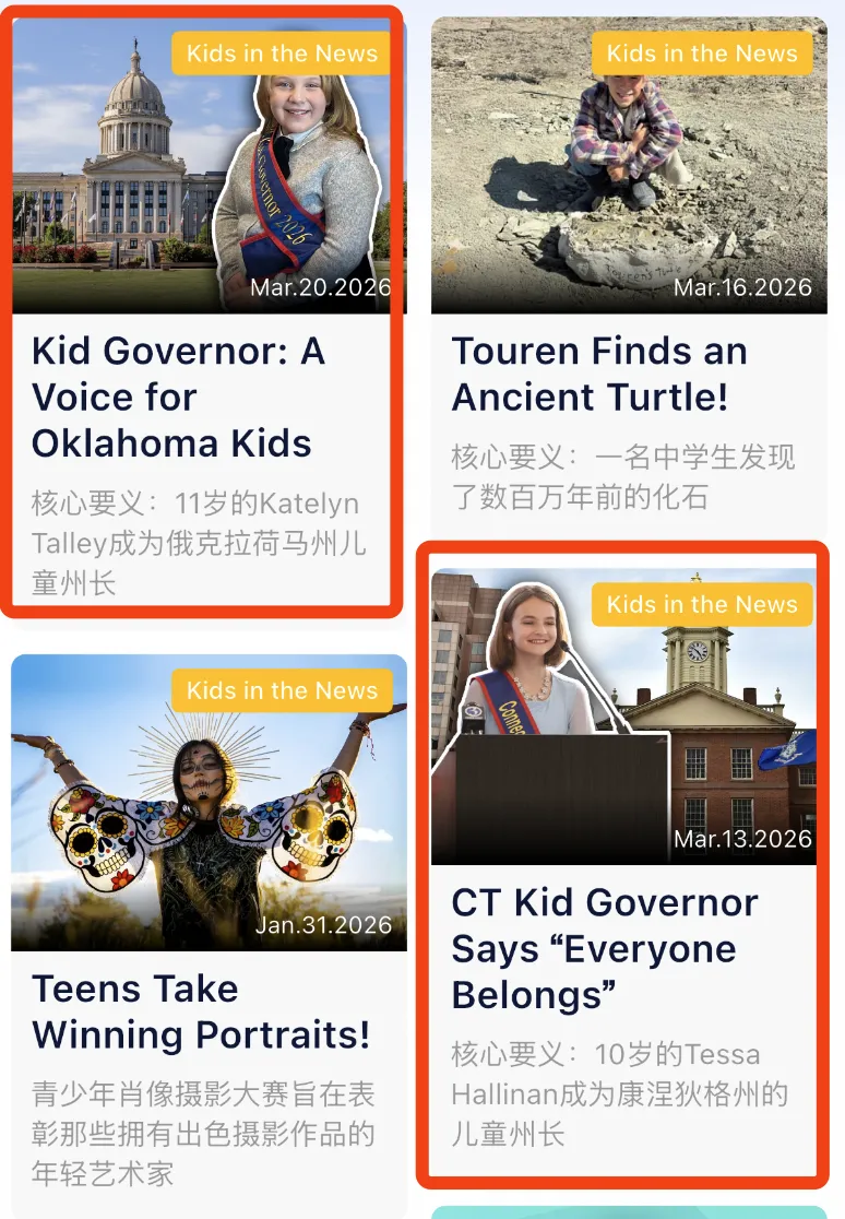 比如,在儿童新闻板块,讲得全是孩子的事儿,有个10岁的女孩成为美国一个州的儿童州长的故事。