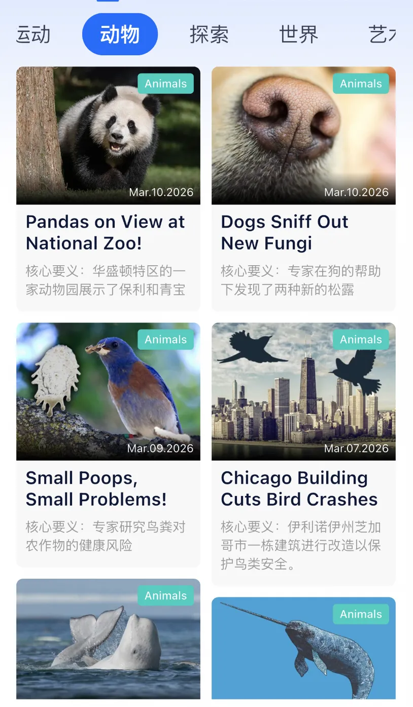 再比如,动物板块,有改造建筑保护鸟类的新闻 —— 孩子本来就对鸟类很感兴趣,一看到标题就点进去了。
