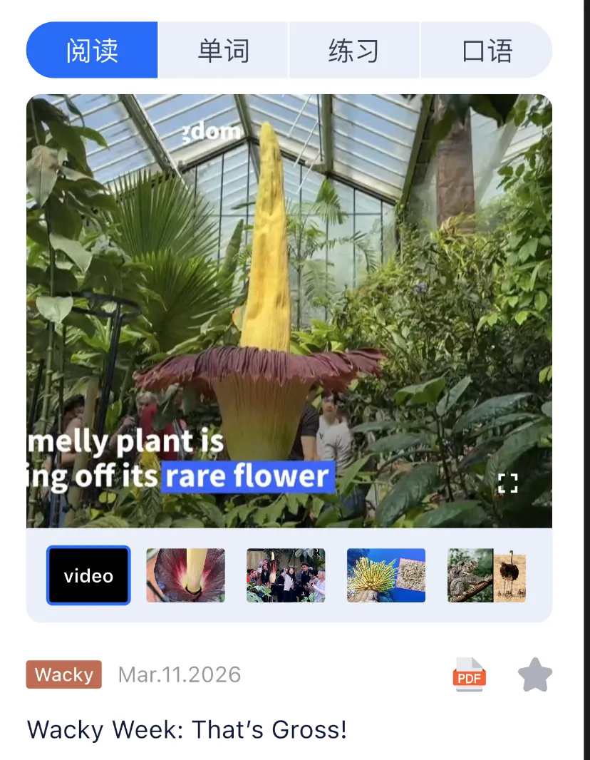 “ 每条新闻还配有内容相关的一段视频和几张照片,可以帮助理解新闻。其中小视频形式多样,我家娃喜欢得不得了。听到Royal Botanic Garden Sydney的Corpse Flower正值花期,还特意发信息问他在悉尼的朋友有没有去看。”