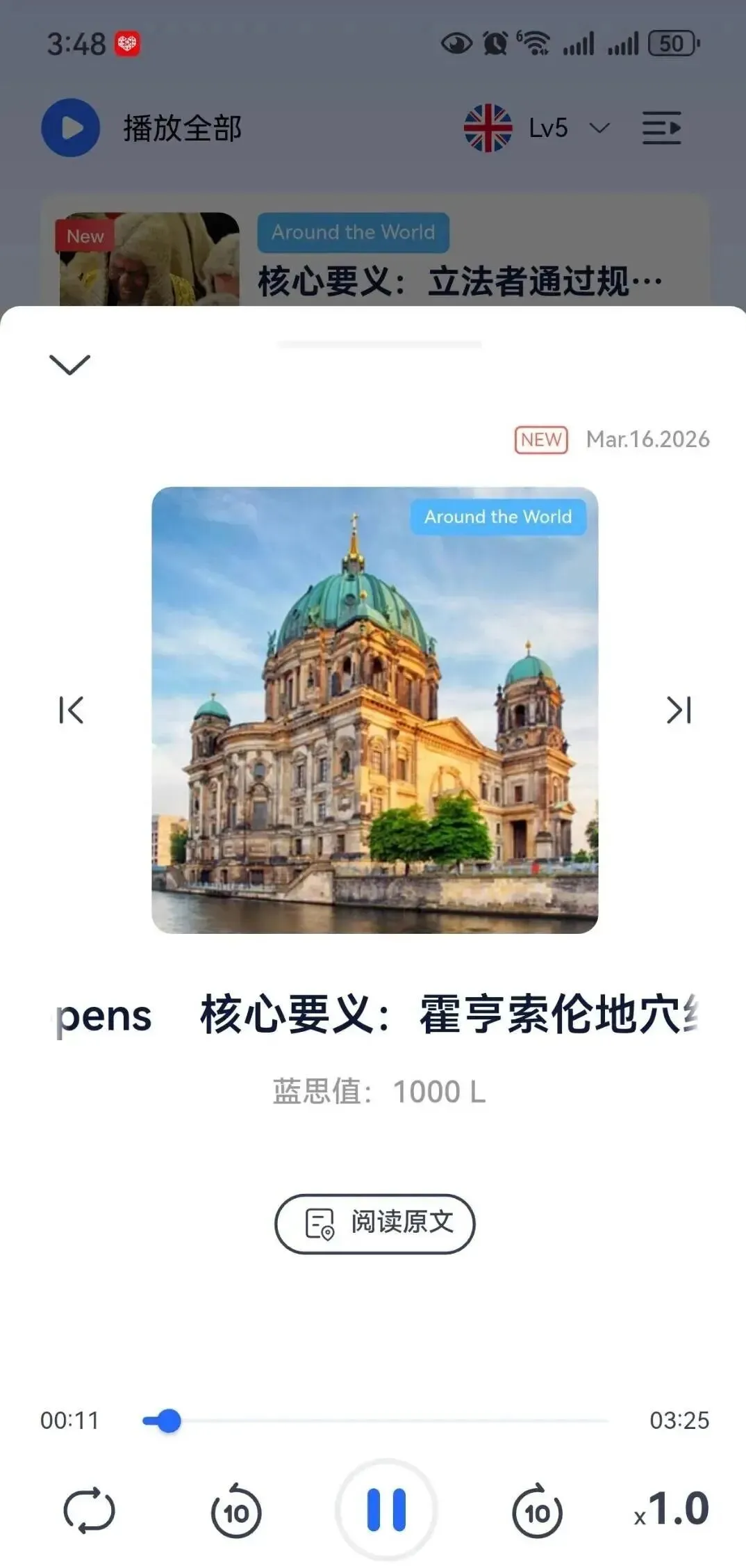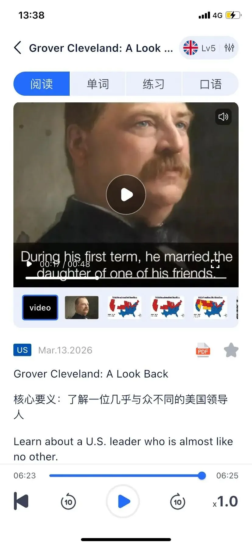 她家娃用的是L5级别(950L-1200L),这个难度的新闻已经接近美国本土六年级孩子的阅读水平。每条新闻大概3分钟左右,听的时候还可以调速。