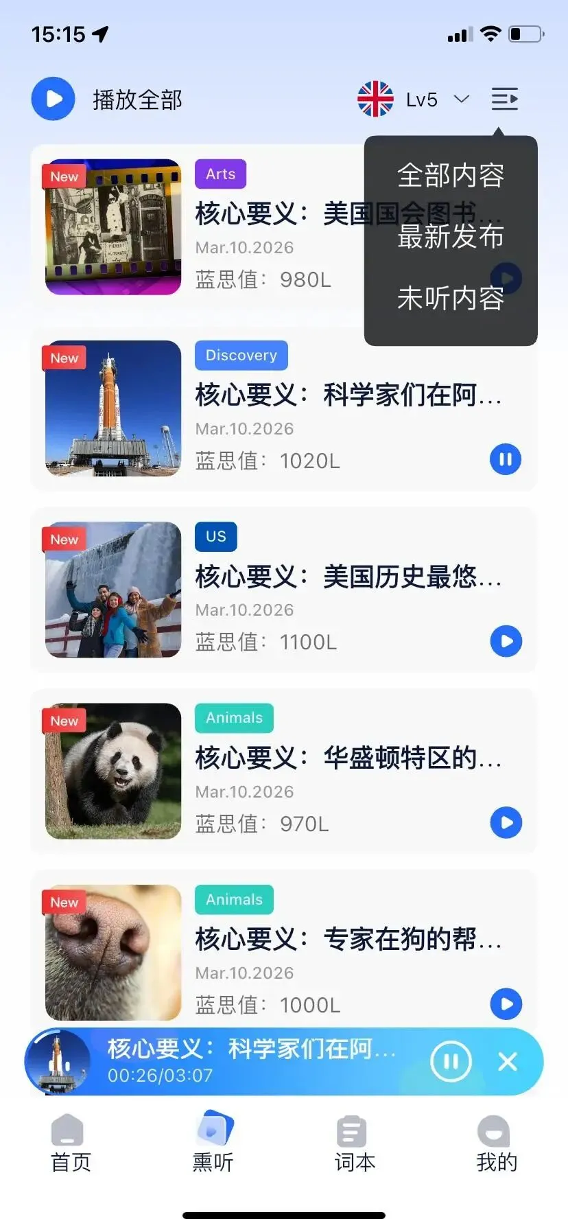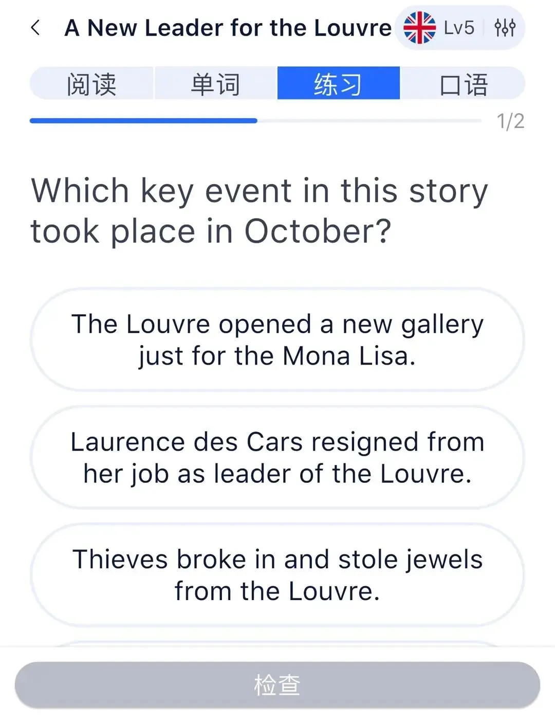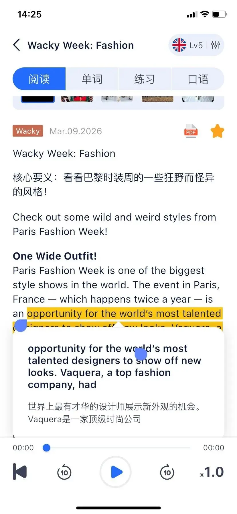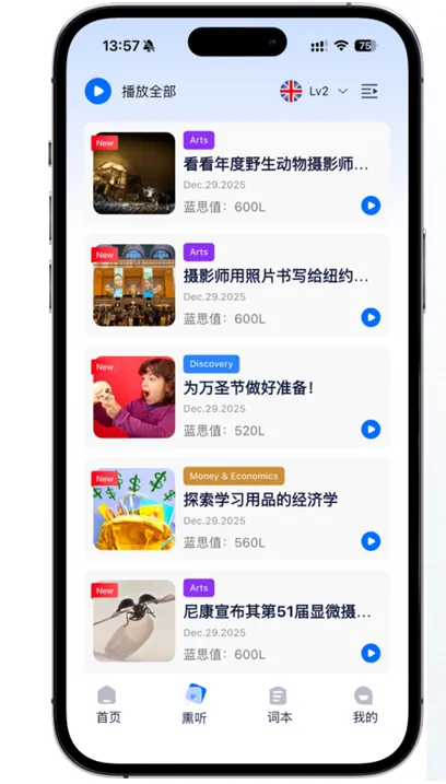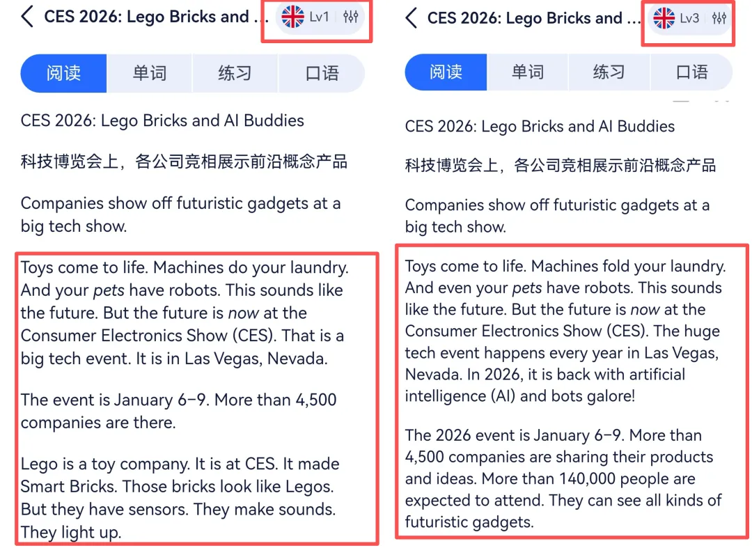同一篇新闻能自由切换难度 —— 低年级孩子读短句、基础词汇,高年级孩子读复杂句式、地道表达,甚至二胎家庭都能共用一个 APP,老大用 L5、老二用 L1,性价比超高。