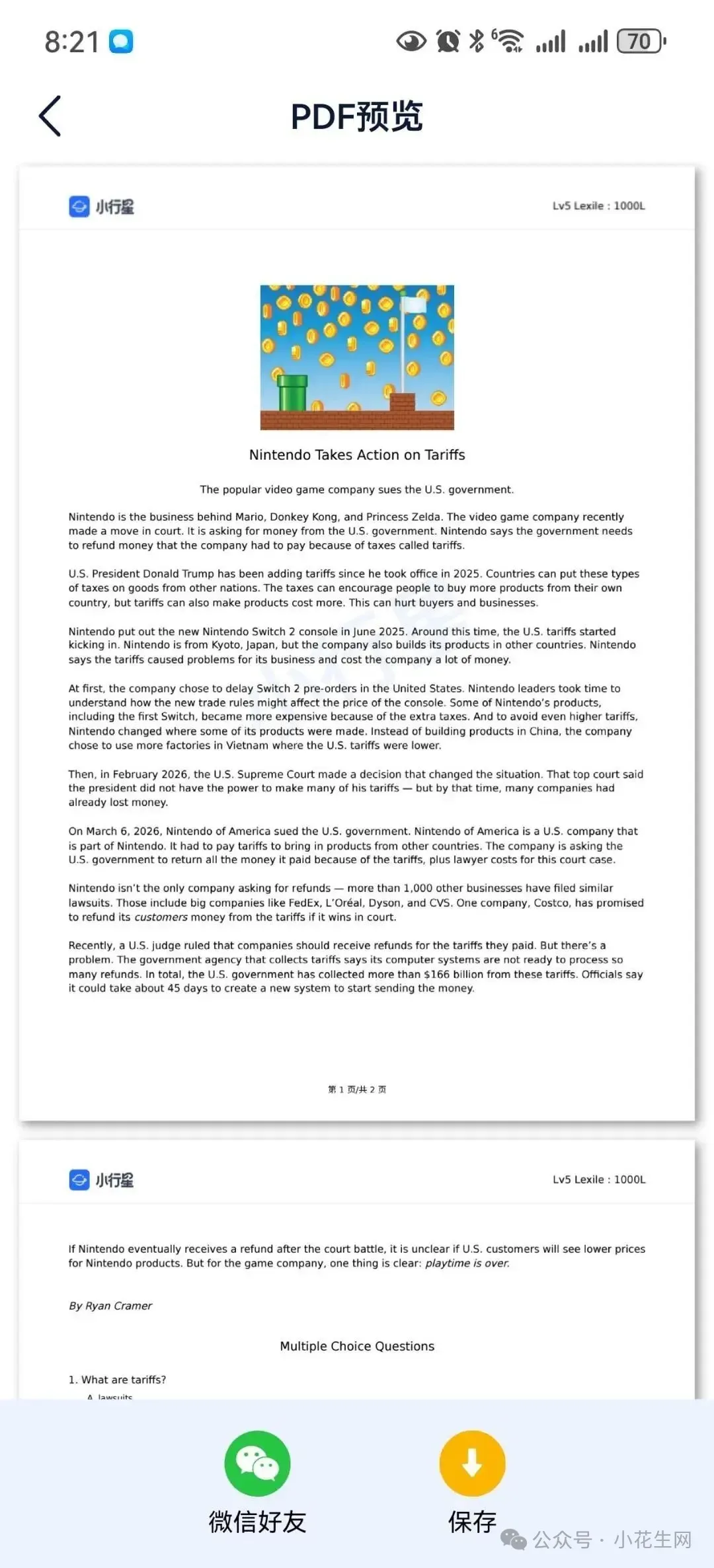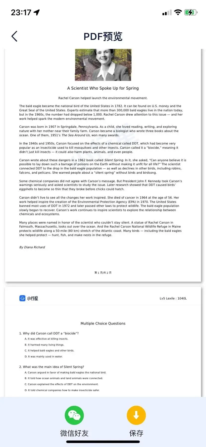 她还发现了一个特别好用的功能:每篇新闻都支持下载PDF,可以打印出来精读,搭配自带的练习题,效果最大化。
