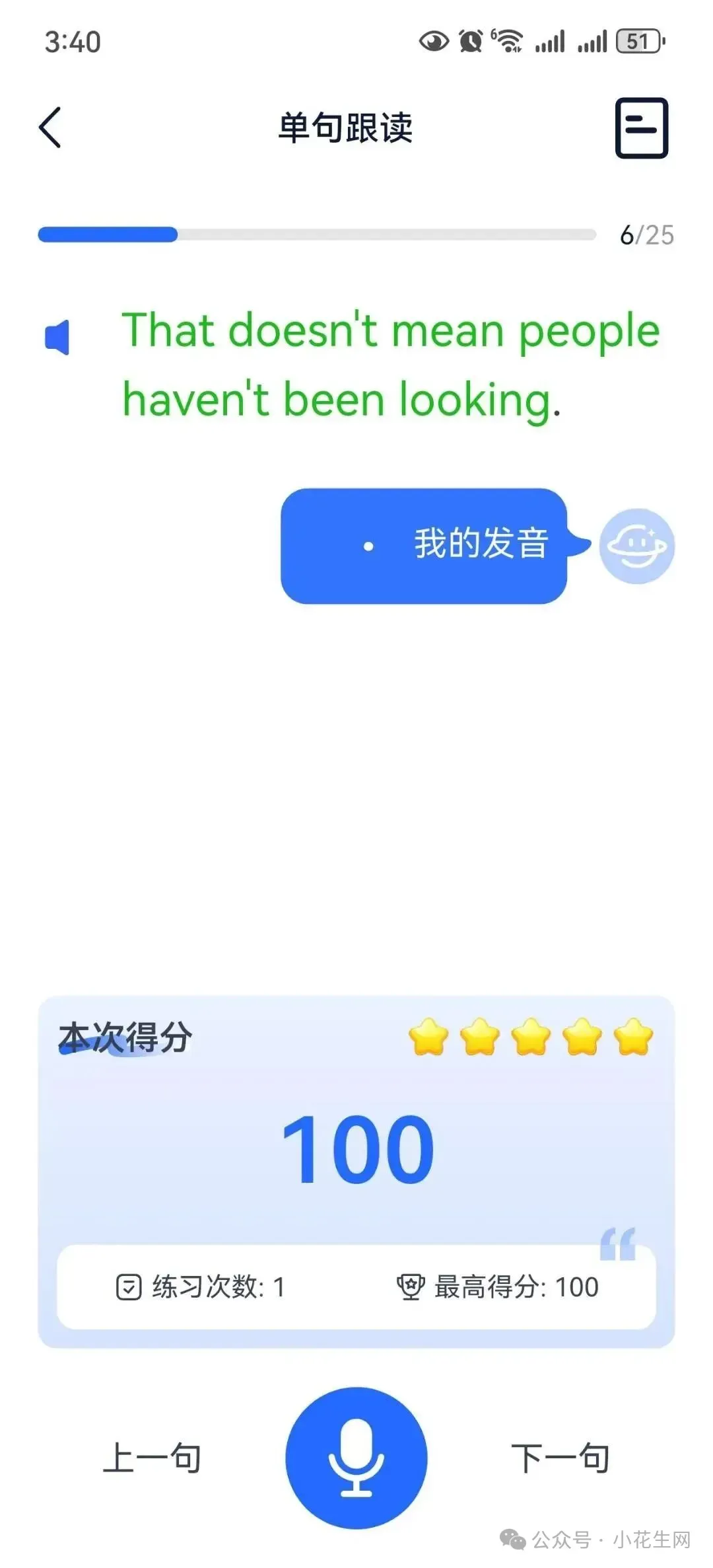 跟读版块也特别吸引娃,说“很有挑战性,还能看到自己的成绩,实时反馈,成就感Max。”