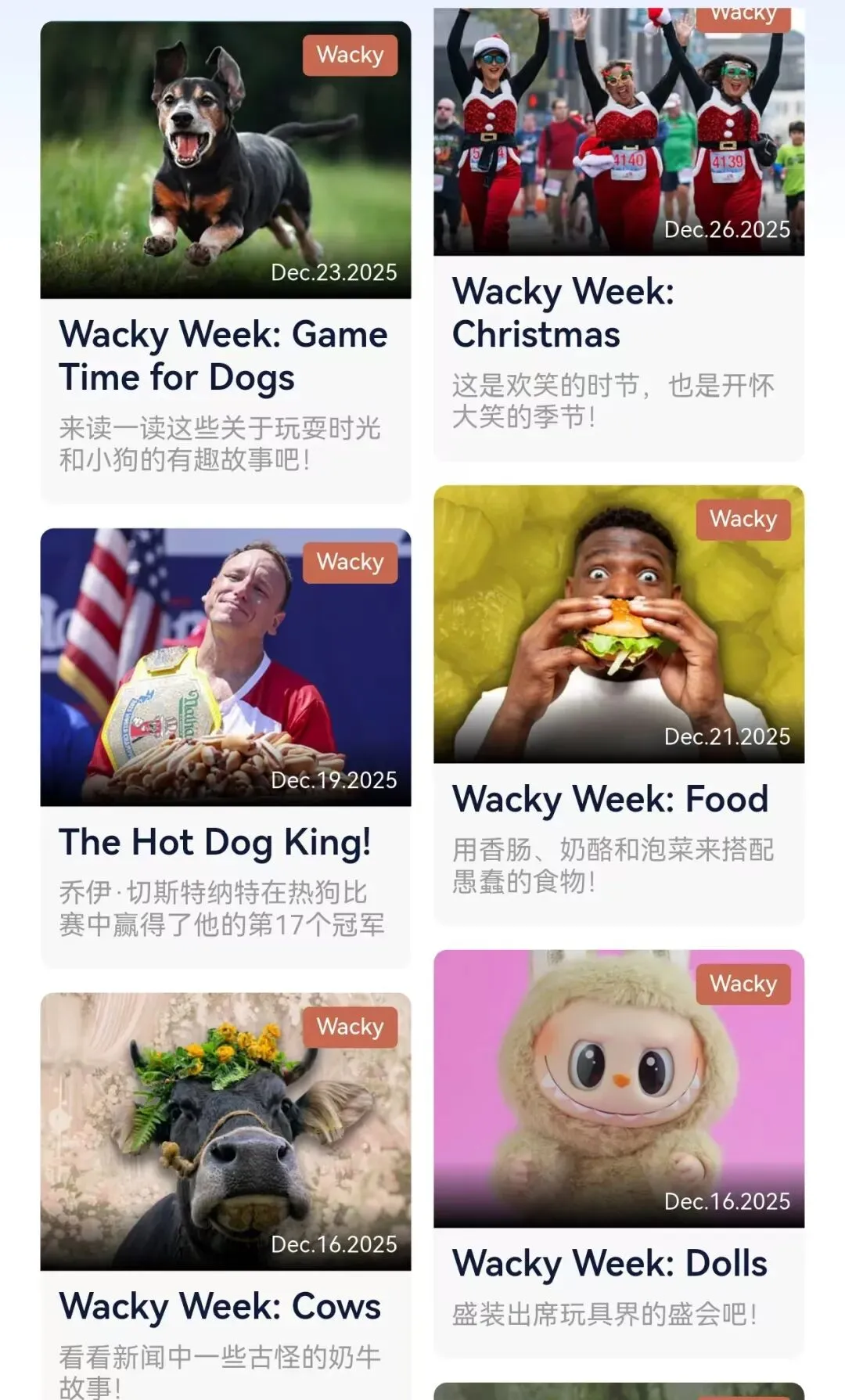 APP里还有超多这类有意思的,贴近孩子们生活的新闻内容。孩子们天生对这些就会充满好奇,配上图片和视频的引导,这样的英语阅读变得有趣,也让孩子们打开眼界看到世界的不同。