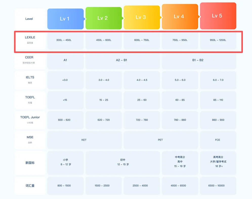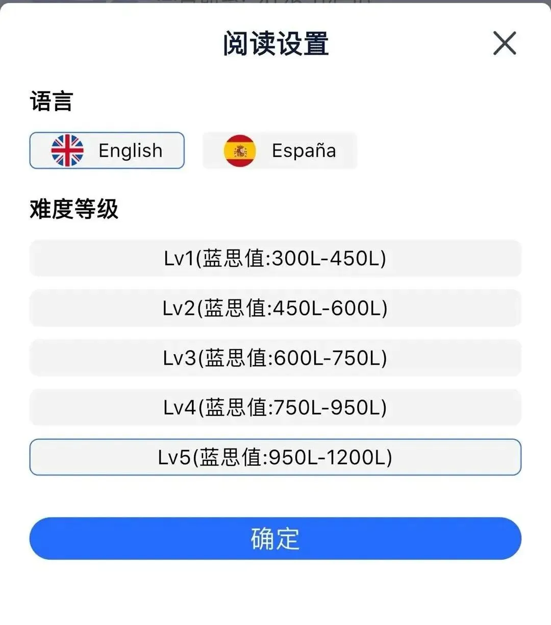 每一篇文章都有蓝思官方分级认证,共分5个蓝思水平,难度划分精准: